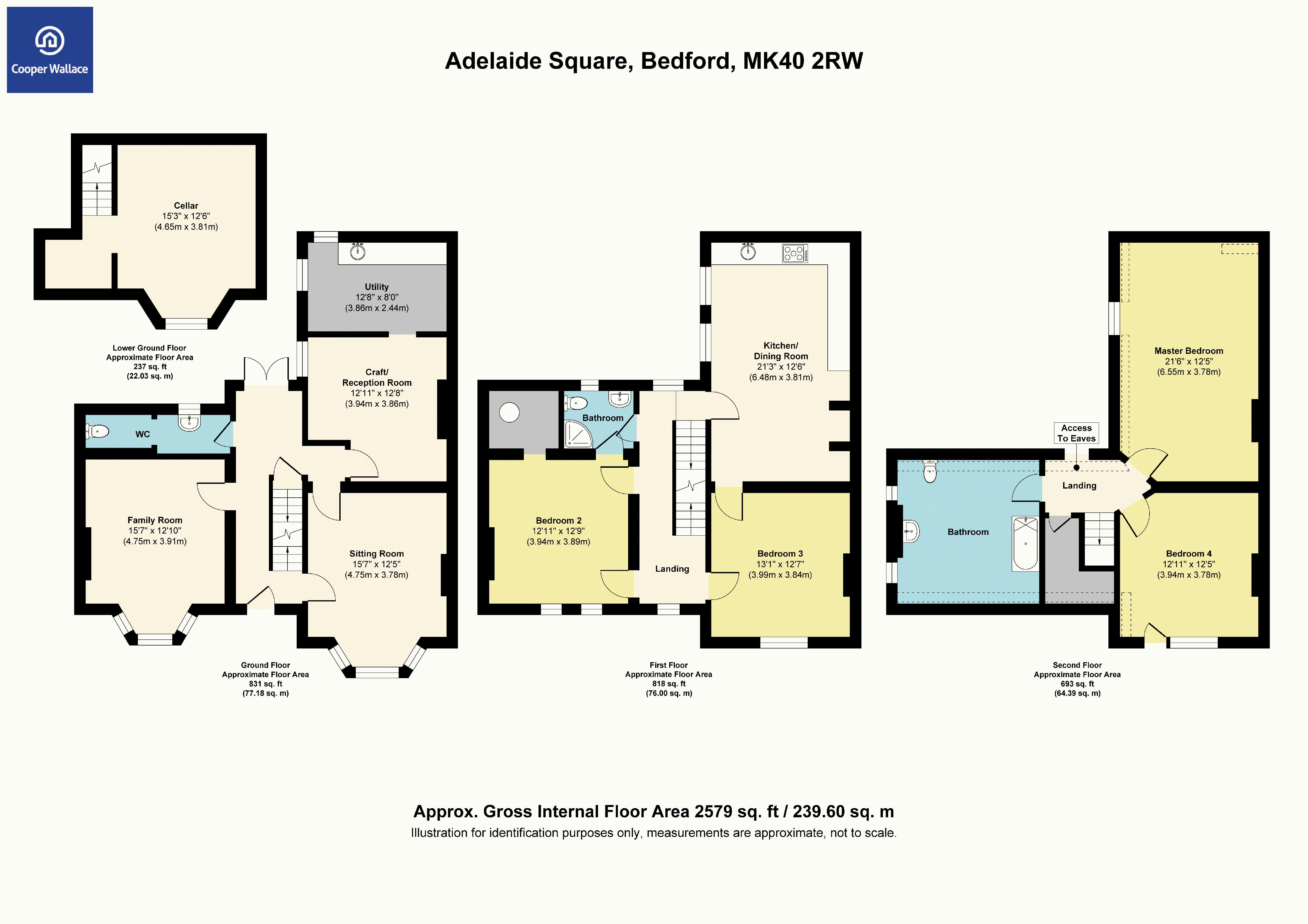 A immaculately presented 4/5 bedroom semi-detached Victorian property in Adelaide Square, Bedford, is a fantastic opportunity with endless potential. Built in 1879, the home’s spacious layout and prime location make it an ideal buy. Originally designed as a family-run dental surgery with residential accommodation on the upper floors, the property has since been converted into a fully residential space.The ground floor includes three reception rooms, a utility room with bespoke wooden cabinets and a butler sink, as well as separate toilet. The first floor boasts a large kitchen/diner flooded with natural light, two double bedrooms, and a shower room. The second floor features two more double bedrooms and a large three piece family bathroom. Additionally, the property offers off-road parking and a charming courtyard garden at the rear.A standout feature is the large basement cellar, which includes a window and electricity—perfect for use as storage or a creative space.Adelaide Square is a pleasant square in a central Bedford location. The best of the county town is within short walking distance, including Bedford Park, The Embankment and the highly regarded Harpur Trust schools. The town centre offers an array of pubs, cafés and restaurants, galleries, museums, theatres, music venues and sports’ facilities, with the nearest amenities just steps from the front door. Retail parks are on the outskirts and Milton Keynes is only half an hour away. With up to five trains per hour and only 15 minutes’ walk to the station, The property is ideal for commuting. Fast trains to London take as little as 45 minutes. The train line provides very easy access to Luton and Gatwick airports and even to Brighton. Bedford is also well-connected via major road links.Disclaimer: Please note we do not test any fixtures, fittings, apparatus or services. Any interested parties should undertake their own investigation into the working order of these items. All measurements provided are approximate and photos are provided for guidance only. Potential buyers are advised to re-check the measurements before committing to any expense. Potential buyers are advised to check and confirm the EPC, estate management charges and council tax before committing to any expense. Floorplans are for illustration purposes only. Cooper Wallace do not verify the legal title of the property and the potential buyers should obtain verification from their solicitors committing to any expense.