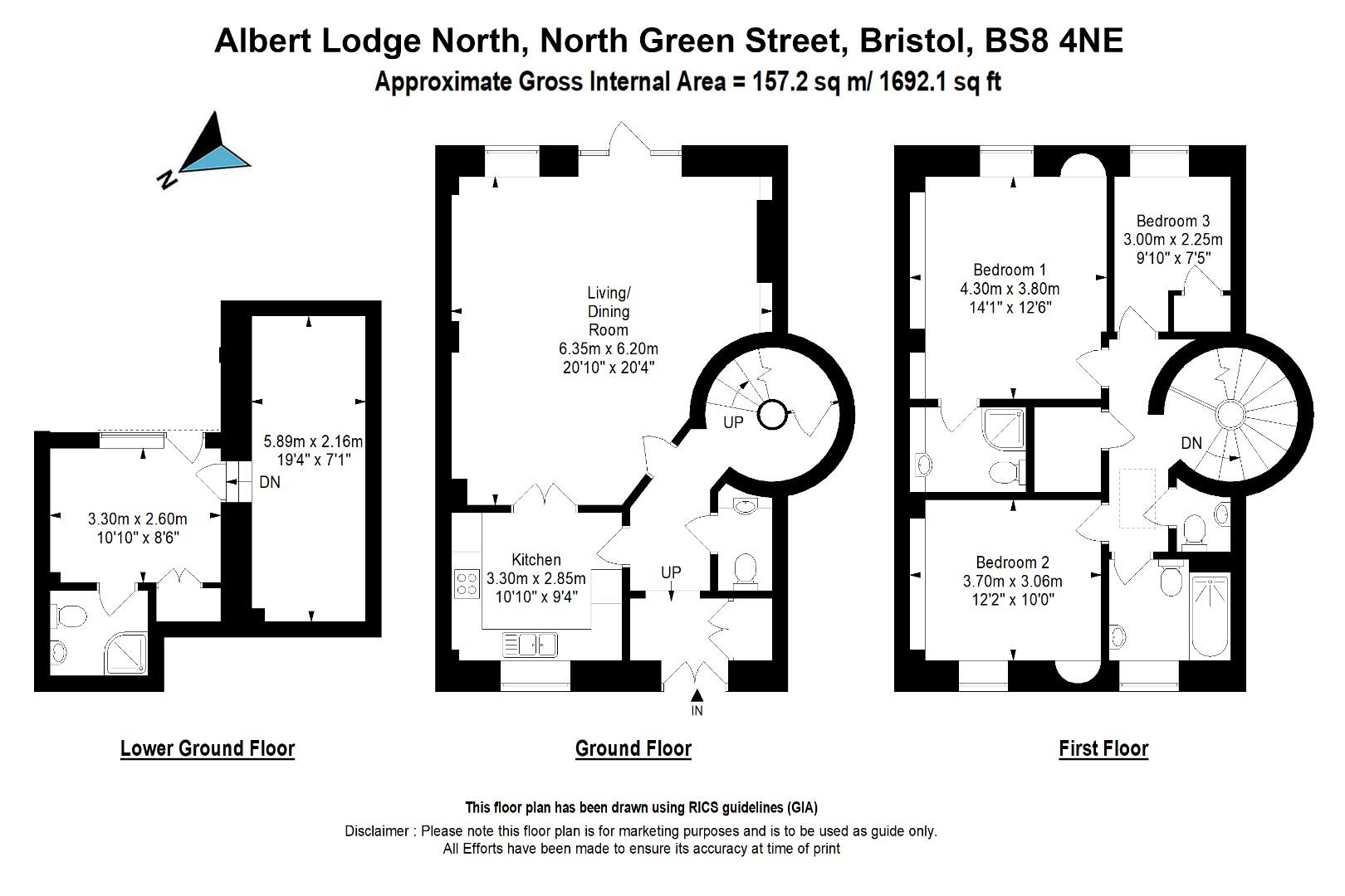 A characterful home with spacious interiors, a private courtyard and a sought-after location between Clifton Village and the Harbourside.At the front of the property, the kitchen is fitted with butter-yellow cabinets and a white tiled worktop, creating a warm and inviting atmosphere. Adjacent, the exceptionally spacious living/dining room enjoys wooden floors and neutral walls, providing a calm backdrop. A fireplace offers a focal point to the space, while built-in shelving within each alcove is both practical and attractive. With ample proportions, the room can easily be arranged into distinct lounge and dining areas. A large sash window and arched French doors allow natural light to pour in and open directly onto the private courtyard.The walled courtyard feels particularly secluded and is currently arranged with outdoor seating, making it the perfect spot for summer entertaining. From here, steps lead down to the cellar, which contains two rooms and a bathroom. Both rooms are currently used for storage but offer exciting potential to be renovated into additional bedrooms, a home office or studio space.At the heart of the home, a striking spiral staircase winds gracefully upwards, with a wrought-iron bannister sweeping alongside it. Above, an ornate ceiling rose adds further period detail to this elegant feature.The first floor is home to three bedrooms. The primary bedroom is a bright and spacious retreat, with an arched sash window and characterful arched alcoves. It also benefits from an en suite with a corner shower and built-in cabinetry for storage. The second bedroom is similarly well-sized and features the same arched details, while the third bedroom, painted in soft green tones, includes a sash window and useful built-in storage.A family bathroom with a shower-over-bath, white tiling and open shelving completes the floor, alongside a separate w/c and a large hallway cupboard.Perfectly located on a peaceful street, Albert Hall North is ideally positioned between the vibrant Harbourside and the cafes, restaurants and boutiques of Clifton Village.