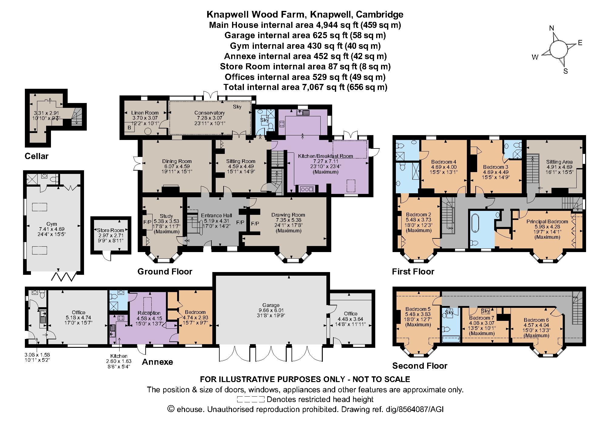 Knapwell Wood Farm is an imposing double-fronted family home providing more than 4,900 sq. Ft. Of sensitively modernised accommodation arranged over three floors. Retained character features include sash glazing and some exposed beams, wooden flooring and original fireplaces.The ground floor accommodation flows from a welcoming reception hall with exposed brick fireplace with woodburning stove and comprises a spacious drawing room with bay window and fireplace with contemporary woodburning stove, a well-proportioned study with bay window and fireplace and a generous dining room with open fireplace and French doors to the garden. Adjacent is a sitting room with feature ingle, ensuite cloakroom/shower room and double doors to a conservatory with French doors to the garden and a useful inter-connecting linen room. The ground floor accommodation is completed by a large L-shaped kitchen/breakfast room with a range of wall and base units, wooden worktops, a Belfast sink, four-oven Aga, modern integrated appliances, space for a sizeable table, French doors to the rear terrace and stairs to a generous cellar.On the first floor the property offers a spacious principal bedroom with bay window, built-in storage and en suite bathroom, three additional double bedrooms with en suite shower rooms and a sitting area accessible over stairs from the kitchen. The property’s three remaining double bedrooms can be found on the second floor, together with aHaving plenty of kerb appeal, the property is approached through a five-bar gate over a block-paved driveway giving access to a detached outbuilding comprising a triple garage, two offices, a utility room with cloakroom and an annexe with kitchen/reception room, bedroom and shower room. Extending to aprox 2 acres, the well-maintained garden is laid mainly to lawn interspersed with mature specimen trees and features numerous seating areas, a garden pond, a detached 24 ft. Vaulted gym with shower room and bi-fold doors to the garden and numerous paved terraces, all ideal for entertaining and al fresco dining.The pretty hamlet of Knapwell sits between Upper Cambourne (which, together with neighbouring Great and Lower Cambourne, comprises the thriving community of Cambourne) and Elsworth. Cambourne provides an excellent range of day-to-day amenities including a wide range of independent shops and a supermarket with petrol station, while Elsworth has a village store, public house, restaurant and primary school. Communications links are excellent: Cambridge station offers regular trains to London in less than an hour, the A14 and M11 give access to major regional centres and the national motorway network and London Stansted Airport provides regular domestic and international services.The area offers a wide range of state primary and secondary schooling including Cambourne Village College (rated Outstanding by Ofsted) together with a good selection of independent schools including St. John’s College, King’s College, cats Cambridge, The Leys and Heritage.