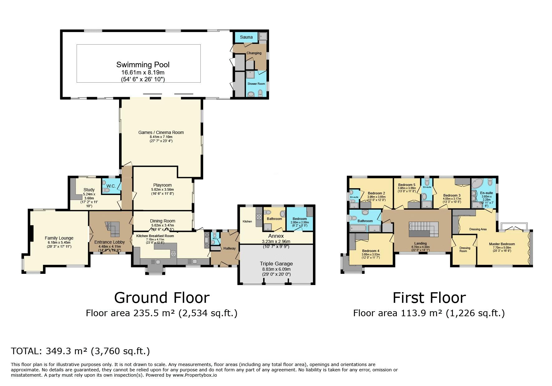 An exquisite 5-Bedroom Detached Residence with One-Bedroom Annexe in a Premium St Neots Private Location.This executive residence adjoins St Neots Golf Course and situated within the most prestigious location of Savile’s Close, St Neots.Nestled within an exclusive three-quarters-of-an-acre plot, bordered by the serene 17th fairway, this stunning family home offers a wealth of features including, a 38ft x 16ft Indoor Swimming Pool & Sauna for all year round enjoyment, dedicated Cinema & Games Room, Tennis Court, Office & Playroom.In addition, the property also features a ground floor Annexe with it’s own Kitchenette, Shower Room and Double Bedroom, perfect for multi-generational living or guest accommodation.Originally acquired in 2007, this house has been lovingly transformed to meet modern living standards while maintaining its charm.Entering the property via a marvellous grand marble entrance hallway with underfloor heating welcomes you into the heart of the home.The open-plan Kitchen-Diner becomes the hub of family life. Complete with state-of-the-art integrated Neff appliances, this space is perfect for both intimate gatherings and grand entertaining.A grand staircase leads you to a spacious Gallery Landing leading you to the five double bedrooms, four of which have en-suite shower rooms, all with fitted wardrobes.Accessing the master bedroom via a generous supplementary room, ideal for a walk in Dressing Room or private Lounge. The master bedroom showcases French doors onto a private glazed balcony overlooking the River Ouse in the distance. A separate dressing area leads into a wonderful four piece en-suite, a retreat of unparalleled comfort, with wall-to-wall granite tiling, underfloor heating, a jacuzzi-style bathtub, spacious rainforest shower with body jets and an integrated television for ultimate relaxation.Outdoor ParadiseBeautifully landscaped grounds adjoin St Neots Golf Club’s 17th fairway with views of the River Ouse possible from the master bedroom balcony. A covered seating area is accessed via patio doors from the family lounge, with an additional spacious paved entertaining area accessed from the cinema room, playroom, dining room and kitchen.Ample parking for 10 + cars, a three-car garage with electric doors and car charging point.Entrance Hallway (14' 7'' x 13' 5'' (4.44m x 4.09m))Double entrance doors lead you through to this wonderful marble underfloor heated entrance hallway with feature staircase and access to ground floor living.Family Lounge (20' 3'' x 17' 9'' (6.17m x 5.41m))Double walnut and glazed doors open into a generous family lounge with marble fireplace and Faber gas fire.Sliding patio doors lead to a covered outdoor seating zone onto gardens. A feature dual aspect corner window and side window to front.Ceiling speakers and LED lighting with ornate coving.Kitchen Breakfast Room (23' 5'' x 13' 5'' (7.13m x 4.09m))Glazed walnut doors lead from the Hallway into this wonderful Kitchen Breakfast room, offering a wide range of contemporary style base and eye level units with granite worksurface throughout.A peninsular breakfast bar provides seating for 6 chairs with pop up electric point.A Neff 4 ring electric and 2 ring gas stove is houses within the peninsular along with a Neff pop up extractor fan. An undercounter full size Wine Cooler and Dishwasher.Two undercounter composite 1.5 sink units to either side, providing both rinse/wash directional functions and the secondary sink features a Qukoor instant hot water tap and filter water tap. Ceiling speakers.A separate range of matching units houses two Neff electric ovens and space for an American style Fridge Freezer.Under floor heated granite flooring throughout with doors leading to the rear garden and side entrance hall. A bay window and large side window to the front aspect.Dining Room (16' 5'' x 11' 4'' (5.00m x 3.45m))Hand made triple bi folding walnut doors with glazed panels offers the option when entertaining large parties to adjoin the Kitchen area creating a fantastic social space.Granite under floor heating and sliding patio doors out to the large paved terrace. Ceiling speakers.Playroom (16' 5'' x 11' 7'' (5.00m x 3.53m))A perfect room space for multiple purposes including Music Room or Playroom with wood flooring, ceiling speakers, wall mounted TV point and sliding doors to the outside terrace.Office (17' 2'' x 11' 9'' (5.23m x 3.58m) L shape)A private office space with two fitted desk units and shelving. Store cupboard housing the central entertainment system connected to the majority of rooms within the building.Sliding patio doors lead to the gardens making this a peaceful space to work from.Wall mounted media and light control panel and recessed ceiling speakers.CloakroomOne of two ground floor cloakrooms with vanity sink unit, WC and window to rear and radiator.Cinema & Games Room (27' 6'' x 23' 3'' (8.38m x 7.08m))A substantial family entertainment area offering an automated projection screen and ceiling mounted projector. Considerable space for seating and multiple patio doors leading to the paved terrace and outside gardens.The current full size Snooker Table and Games Table provide an excellent use of space.Wall mounted speakers and multiple lighting options available.Door and large glazed windows lead to the Swimming Pool.Swimming Pool & Sauna (54' 5'' x 26' 7'' (16.57m x 8.10m))A substantial indoor fully heated Swimming Pool with tiled side and ample space seating of large groups.The Swimming Pool measures 38ft x 16ft and has an automated cover and it's own pump room and storage rooms.A timber clad ceiling with multiple recessed lights and speaker system with exposed brick walling.Sauna & Changing Area.A further room offers a fitted Sauna 6ft x 4,6ft two shower cubicles, WC and changing area.Three separate sliding patio doors lead to the paved terrace, gardens and Tennis Court.Tennis CourtAccessed via the Swimming Pool or gates leading from the gardens, this full size Tennis