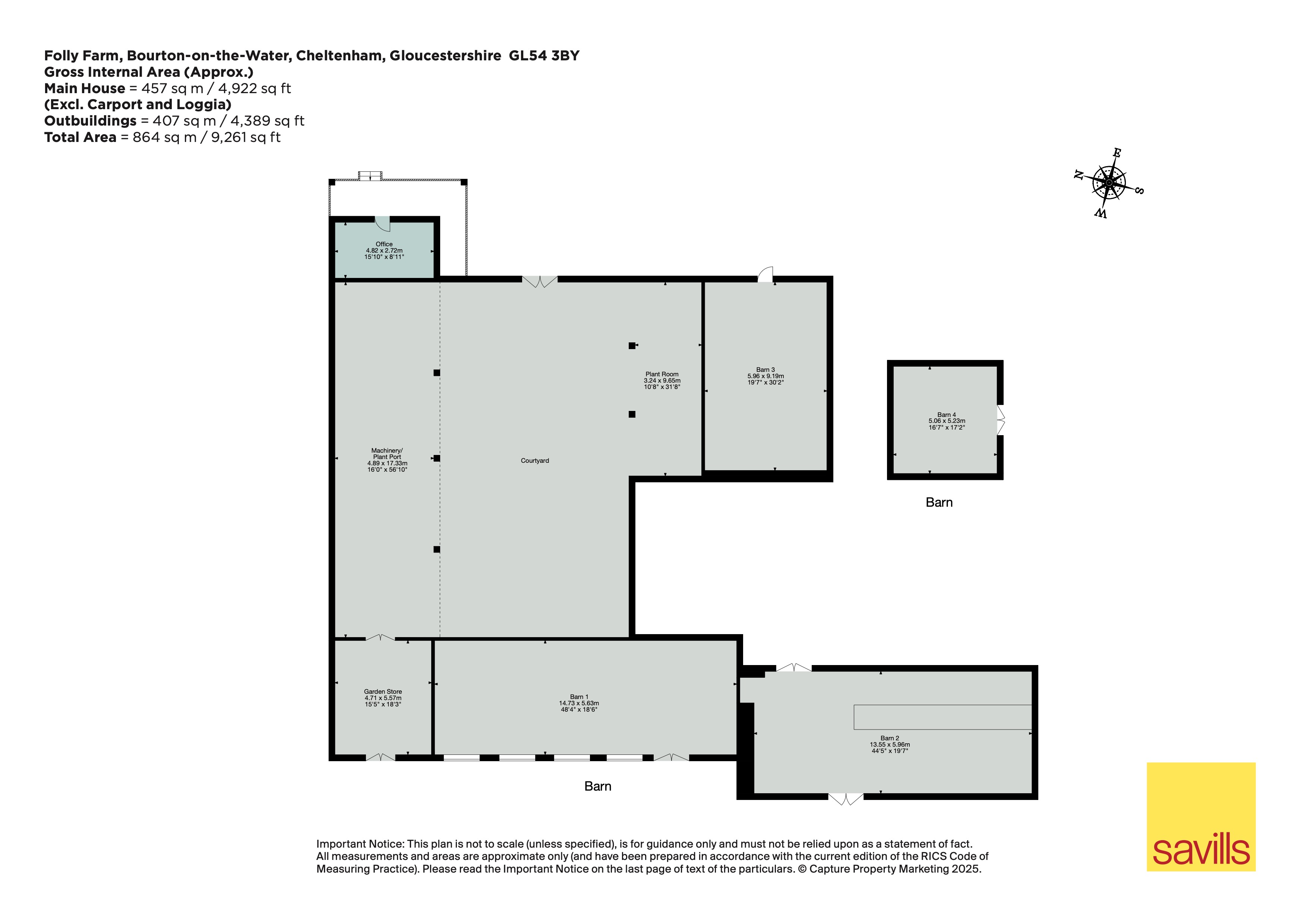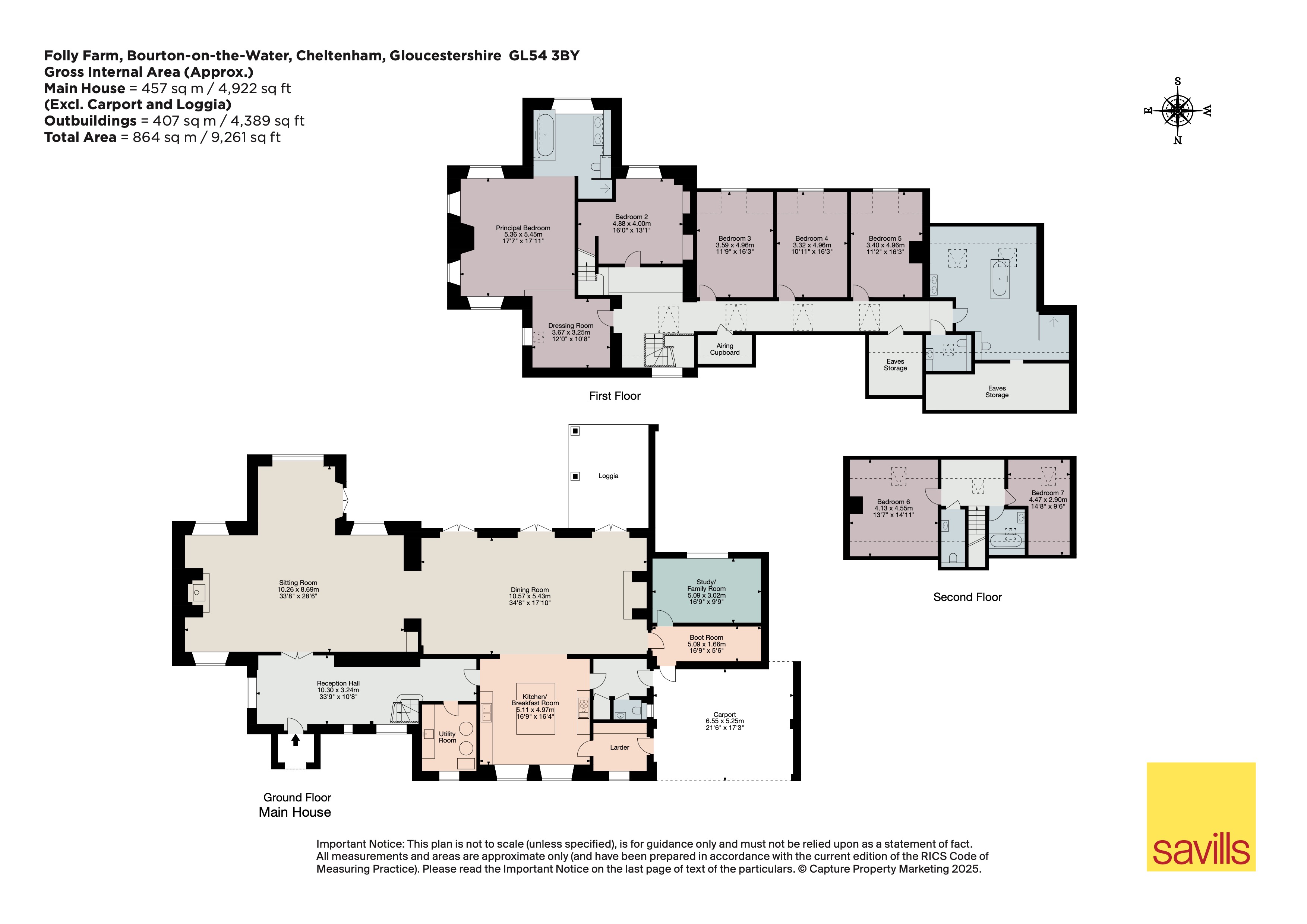 Overlooking 30 acres of rolling countryside and spring-fed lakes, this idyllic property blends timeless rural charm with elegant modern livingDescriptionFolly Farm has an enormous sense of rural calm with its south-facing accommodation benefitting from one of the great Cotswold valley views, over most of the property’s 30 acres and four spring-fed lakes. There are extensive outbuildings with scope for multi-purpose development, grazing land including a good level paddock, well-maintained mature woods and spring-fed lakes, ideal for wild swimming. Folly Farm combines period charm with modern proportions. Designed for contemporary living, this unlisted property extends to 4,922 Sq Ft, with the kitchen, dining room and sitting room offering a vast sense of space and flow, ideal for family life. The current owners have resurfaced the floors laying re-claimed oak throughout the ground floor. There is underfloor heating throughout the ground floor.Adjoining the kitchen is a well thought out walk-in larder, utility room and boot room. On the first floor is an impressive principal bedroom suite with charming views over the valley, four further bedrooms, a family bathroom. All the light filled rooms enjoy spectacular views to the south. A further flight of stairs provides access to the second floor with two guest rooms and a bathroom.The driveway sweeps into a gravel courtyard with extensive parking. To the side is a range of stone and timber-clad outbuildings including a number of stables, storage sheds, and an attractive courtyard. This outdoor footprint has scope for multi-purpose development (subject to obtaining the necessary planning permissions).The principal garden is laid mainly to lawn surrounded by mature shrubs and beech hedges and an apple orchard, whilst to the east of this is a walled kitchen garden. Formerly a duck farm, within the grounds are four spring-fed lakes that link during the winter creating an oasis of water, flora and fauna. Of the 30 acres, just under 15 acres are laid to paddock and wildflower meadows with woodland beyond, which is a natural haven for wildlife.LocationFolly Farm is 2.8 miles from Bourton-on-the-Water, one of the larger North Cotswold villages situated in the Windrush Valley. The village offers a range of shops for most every day needs with a doctor’s surgery, banking services, solicitors and dentist. The hilltop market town of Stow-on-the-Wold lies 6.4 miles north of Folly Farm with many independent shops and a treasure trove of antiques, boutiques, art galleries, bookshops and local cheese, chocolate and homeware outlets. Notably, Daylesford Organic and The Bamford Club are 10.1 miles away. The flagship Farm shop – café – restaurant complex features seasonal produce, butchery, garden centre, spa and members club. Recreational opportunities include Padel at Far Peak, golf at Burford and Naunton Downs, Polo at Cirencester Park, racing at Cheltenham and sailing at Cirencester Water Park. There are a number of excellent walks including the Cotswold Way and the Gloucestershire Way.Square Footage: 4,922 sq ftAcreage:30 AcresDirectionsFollowing the A436 from Bourton-on-the-Water, the postcode will take you to a turning to Upper Harford Airfield. Please ignore this final right-hand turning and continue for 100m to the next left hand turning sign posted Folly Farm. If you take the first left hand turning (not straight on) you will follow a lane to Folly Farm itself, which is located at the end of this lane.WHAT3WORDS///rejoins.cherished.scorchedAdditional InfoThe Fosse Way provides direct access to the Midlands and south to Cirencester. The A40 links Cheltenham to Oxford and then joins the M40 at Junction 8. There are regular trains from Kingham Station (11.4 miles) to London Paddington taking from 1hr 18 minutes.There is a wide choice of state and private schools close to Folly Farm. The highly regarded Cold Aston Primary School is located within the neighbouring village of Cold Aston. There is also a primary school and highly regarded secondary school, The Cotswold School which has earned an impressive reputation as a popular and successful 11-18 comprehensive academy. Cheltenham is also considered as an educational hot spot with schools including, Cheltenham Ladies College, Cheltenham College & Dean Close.Cotswold District Council Tel: Mains water, electricity, private drainage. Oil fired central heating.The sale is subject to all rights of support, public and private rights of way, water light, drainage and other easements, quasi-easements and wayleaves, all or any other like rights, whether mentioned in these particulars or not.Viewings strictly by accompanied appointment with Savills