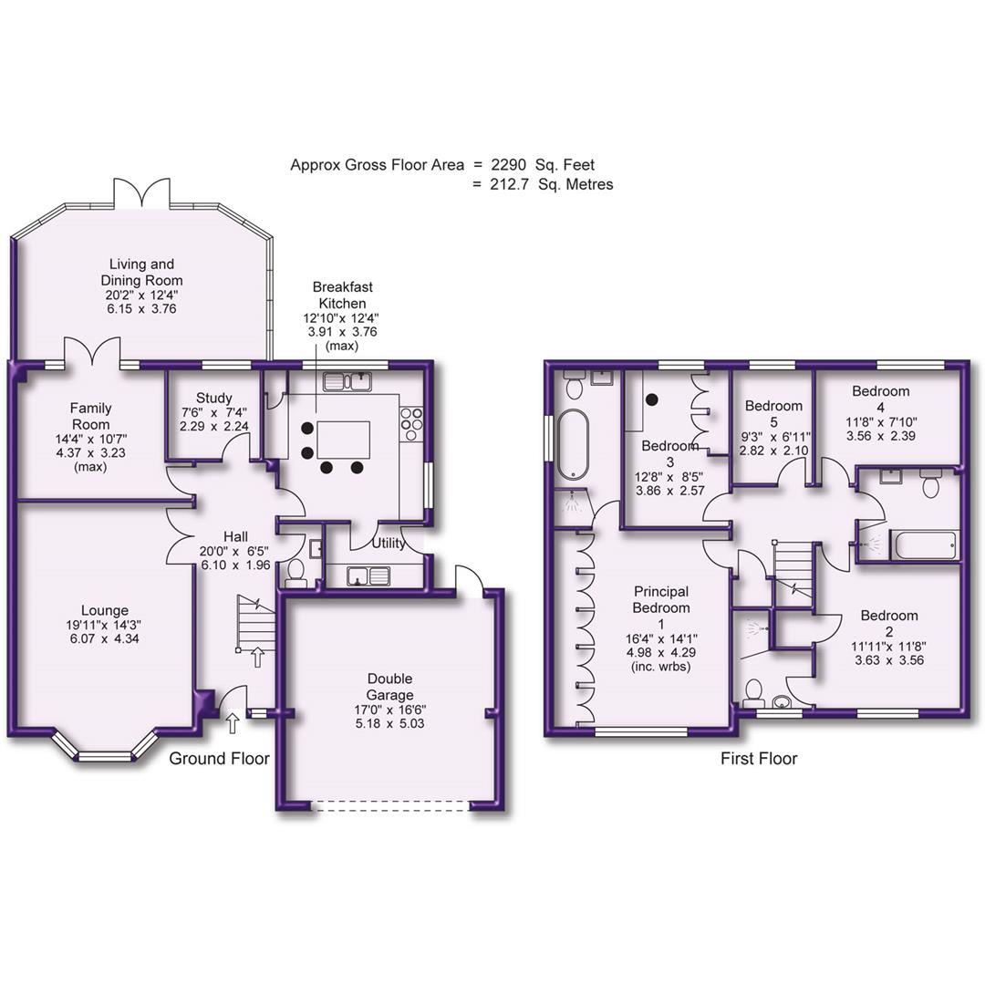A beautifully presented and well proportioned, modern detached family home, located at the head of A peaceful cul de sac, in this desirable location, ideally situated for excellent schools. 2290sqft.Porch. Hall. WC. Lounge. 250sqft Living and Dining Room. Home Study. Breakfast Kitchen. Utility. Five Bedrooms. Three Bath/Showers. Driveway. Double Garage. Superb Gardens.A fantastic, modern Detached family sized home located on head of a peaceful cul-de-sac on this popular development by Redrow Homes, perfectly located within walking distance of both The Bollin and Bowdon Church Schools and within easy reach of Altrincham Boys’ and Girls’ Grammar Schools. In addition, there are local convenience shops on the doorstep as well as a park with children’s play area.The property stands on what is probably one of the larger plots on the development, which gives the property excellent potential to be extended further should anyone require, subject to any necessary consents, without meaningfully imposing on the useable garden space.As it stands, the accommodation extends to approximately 2300 square feet, providing Three Reception Areas to the Ground Floor in addition to a Study and a stylish Breakfast Kitchen with Utility Room off. To the First Floor are Five excellent Bedrooms served by Three well-appointed Bath or Shower Rooms, Two being En Suite to the Principal and Guest Bedrooms.The property is immaculately presented and ready to move into with the minimum of fuss.Comprising:Canopied Porch. Spacious Hall with wood flooring, cloaks cupboard and staircase leading to the First Floor.Ground Floor WC, well appointed with a white suite with chrome fittings providing a WC and wash hand basin. Wood flooring.Lounge approached through double doors from the Hall and having a, angled bay window to the front elevation. Impressive fireplace surround with display recess.Family Room with double glazed French doors with side windows leading to the:250 square foot Living and Dining Room with high vaulted roof, ideal for day to day informal living and enjoying a delightful Garden aspect, with French doors providing access to the garden.Home Study with wood flooring and a window to the rear.Breakfast Kitchen, well appointed with two double glazed windows overlooking the gardens and wood flooring. The Kitchen is fitted with a range of traditional style units with granite worktops over arranged around a central, granite top island unit incorporating a breakfast bar. Freestanding range cooker with double ovens, gas burners and extractor fan over. Integrated dishwasher, fridge and freezer units.Utility Room with built in base unit, worktop and sink with space for a washing machine and dryer. Cupboard housing the central heating boiler. Door leading to the Garden.To the First Floor are Five Bedrooms served by Three Bath or Shower Rooms.Principal Bedroom One with a window to the front and having an extensive range of wall to wall, floor to ceiling built in wardrobes and storage spaceA door leads through to the En Suite Bathroom, beautifully appointed with a reproduction Victorian style suite in white with chrome fittings, providing: A claw feet slipper bath, wash hand basin on stand, WC and enclosed shower cubicle with thermostatic shower.Bedroom Two with a window to the front and served by an En Suite Shower Room fitted with a suite in white with chrome fittings, providing an enclosed shower cubicle with thermostatic shower fitting, WC and wash hand basin. Chrome ladder radiator.Bedroom Three with built in wardrobes and furniture, currently used as a Dressing Room with a window to the rear.Bedroom Four with a window to the rear.Bedroom Five with a window to the rear.The Bedrooms are further served by a Family Bathroom well appointed with a suite in white with chrome fittings, providing a bath, shower cubical, wash hand basin and WC. Window to the rear.Externally the front of the property is approached via a Driveway providing off road parking and leads to the substantial brick built Integral Double Garage.To the front of the property there is a Garden frontage with a neat lawned area. The Rear Garden is much larger than average for this type of property and the development, with a large stoned paved patio area across the back of the property. Beyond, the Garden is laid principally to lawn with maturely screened borders with a variety of shrubs, bushes, trees and plants.This is an excellent example of a most popular design of property and should be viewed without delay.- Freehold- Council Tax Band G