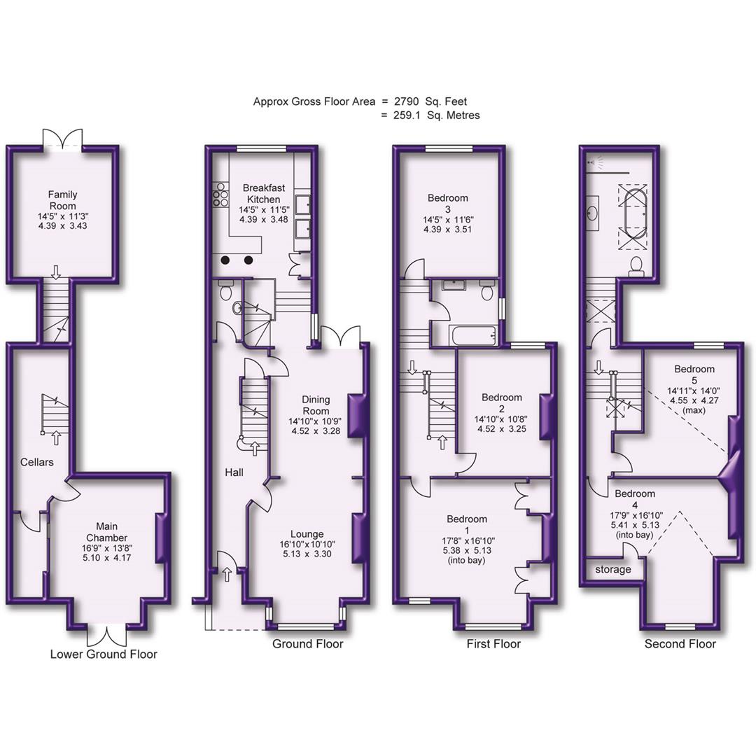 A superbly proportioned and beautifully presented victorian family home ideally located on this popular road, within walking distance of hale village and altrincham town centre. 2790sqft.Porch. Hall. WC. Lounge. Dining Room. Breakfast Kitchen. Family Room. Five Double Bedrooms. Two Bath/Showers. Cellars. Driveway. Garden.A beautifully proportioned, updated and improved Victorian property perfectly located on this desirable road, ideally positioned within walking distance of Hale Village with its range of fashionable shops, eateries and bars and Altrincham Town Centre, the Metrolink and the popular Market Quarter. In addition, the property is also within easy walking distance of both Altrincham Boys and Girls Grammar Schools.This well presented home offers extensive and versatile accommodation over four floors extending to approximately 2790 sq ft providing a Hall, WC, Open Plan Lounge/Dining Room, Family Room and Breakfast Kitchen, served by Five fabulous Bedrooms and two well appointed Bathrooms.To the Lower Ground Floor are the Cellars which provide extensive valuable storage and offer the potential to convert into additional accommodation, subject to any necessary consents.Externally, there is a block paved Driveway providing off road parking for two cars to the front and a lawned garden with patio area to the rear.Comprising:Recessed Porch. Entrance Hall with spindle balustrade staircase rising to the first floor. Doors provide access to the ground floor living accommodation. Wood flooring. Corniced ceiling.Ground Floor WC with white suite and chrome fittings. Traditional tiled floor. Picture rail surround.Lounge with attractive bay window to the front, covered by Venetian blinds. To the chimney breast there is a traditional timber fireplace surround with cast iron, open grate fire. Wood flooring. Corniced ceiling.Dining Room with French doors opening onto the gardens. Wood flooring.An opening leads through to an Inner Hall with steps up to the Breakfast Kitchen and down to the Family Room, creating a connected Family Room, Dining Room and Breakfast Kitchen.Breakfast Kitchen with a low ledge window enjoying an elevated view of the garden, fitted with a range of base and eye level units, with granite worktops over, with inset double bowl sink units. Freestanding appliances which may be available to the incoming purchaser, subject to negotiation, include a Rangemaster range cooker with five gas burners and double ovens and an American-style fridge freezer. Integrated Neff dishwasher. The work surfaces return to a peninsular unit breakfast bar. Tiled flooring.Steps lead down to the Family Room, effectively at Lower Ground Floor level but with the external ground levels excavated to make this room at garden level with French doors onto the garden. Wood flooring. Coved ceiling.First Floor Split Level Landing with spindle balustrade staircase continuing to the Second Floor and serving Three Double Bedrooms and the Family Bathroom.Principal Bedroom One is beautifully proportioned, positioned to the front with bay window feature, having a marble fireplace surround. Built-in wardrobes provide hanging and storage space. Intricate corniced ceiling.Bedrooms Two and Three are both double rooms overlooking the rear.Family Bathroom fitted with a white suite and chrome fittings, providing a claw-foot bath with thermostatic shower over and glazed screen, wash hand basin and WC. Extensive tiling to the walls.Second Floor Split Level Landing with the accommodation located under the eaves of the property, with attractive sloping ceilings.Bedroom Four is currently utilised as a Home Office, with ample space for two to work from home, with an opening to the gable front window and access to under eaves storage space.Bedroom Five is another large double room with a window to the rear.These Bedrooms are served by a particularly spacious Bathroom with Velux skylight windows, fitted with a white suite and chrome fittings providing a double ended, free standing claw-foot bath, a large walk in shower, wash hand basin unit and WC. Tiling to the shower area.To the Lower Ground Floor, the Cellars offer excellent potential to convert, subject to any necessary consents. They offer a large Hall area providing a Utility space with room for a washing machine and tumble dryer and extensive storage. A further small Chamber with a Belfast pot sink and a large main Chamber with windows opening to a deep light well to the front. Worcester Bosch gas central heating boiler installed in 2024.Externally, the front of the property is approached via a block paved driveway providing off street parking for two cars side by side. The road has no parking restrictions, so guests are free to park over the end of the driveway.To the rear there is a sunken stone-paved patio area adjacent to the back of the house accessed via the French doors from the Family Room and the Dining Room, beyond which the garden is laid principally to a shaped lawn with deep borders stocked with shrubs, bushes and plants and closed with tall brick walling. Paved ginnel at the side of the house offers space for garden storage- Freehold- Council Tax Band F
