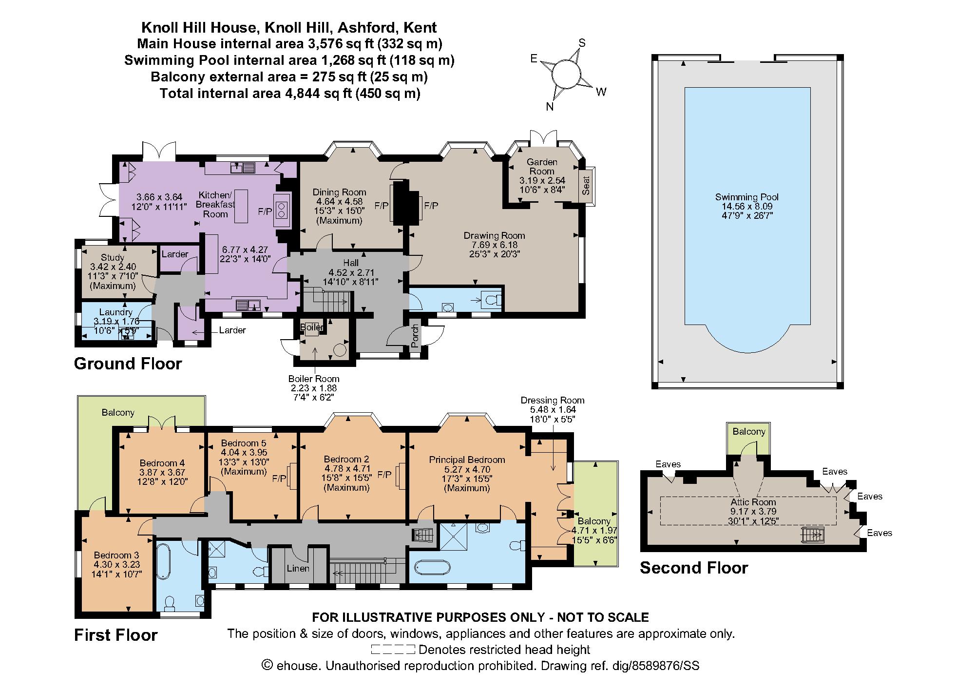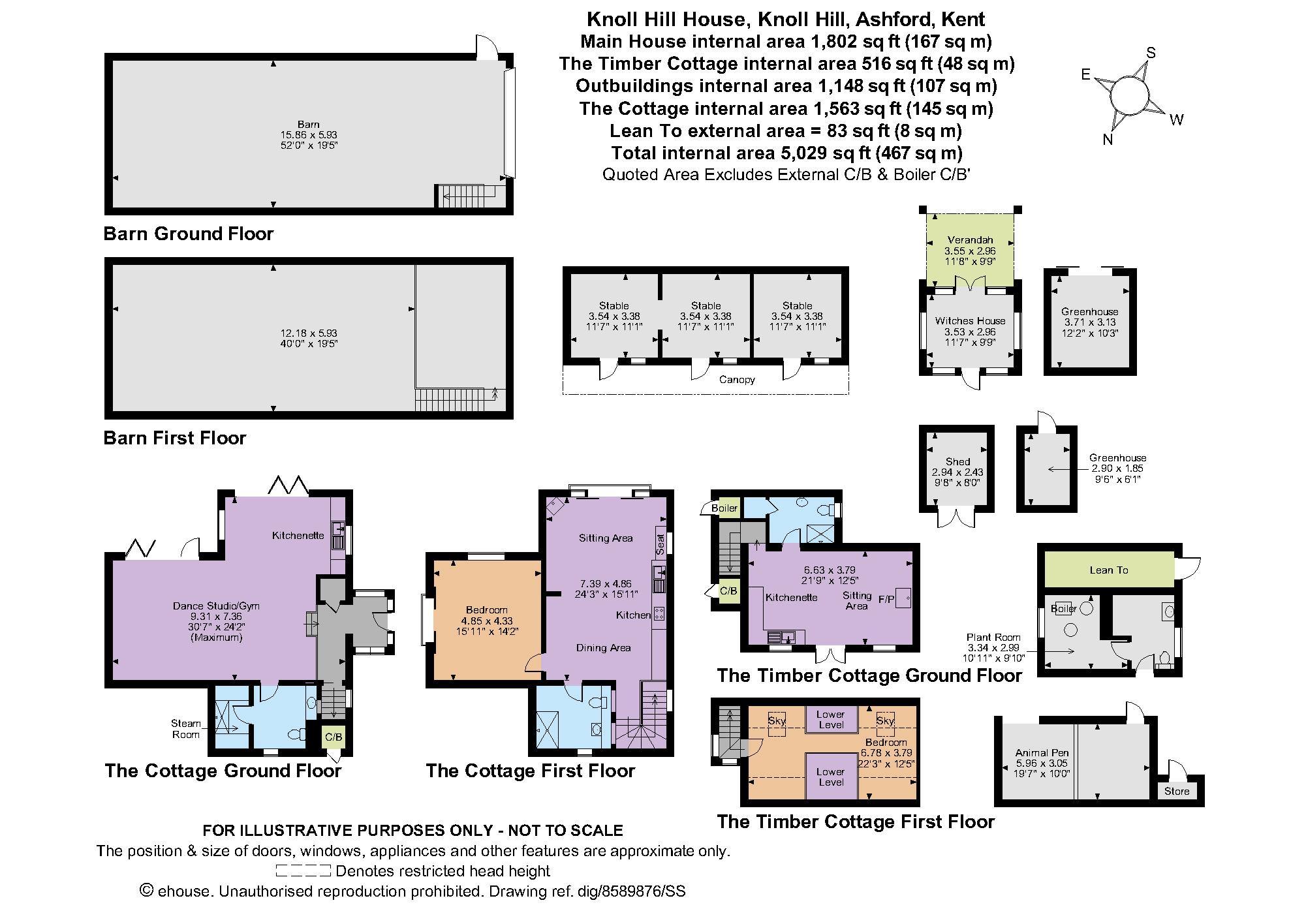 Knoll Hill House sits in a breathtaking position at the top of the escarpment above the Romney Marsh which affords the most sensational far-reaching views, looking across the marsh to the coast and the sea in the distance.Built in 1910 the house has much charm, providing a comfortable and spacious space in which to live and entertain against this stunning backdrop. The principal house is arranged with the reception rooms across the back of thehouse where the bay windows capture the views from the dining, drawing and garden rooms.The kitchen is a welcoming room arranged around an island and Aga. There is plenty of room for a good-sized table and French doors open to the terrace and the gardens beyond.Stairs rise past a tall window to the first floor where there are five bedrooms, four of which face the Romney Marsh and the spectacular views The principal bedroom has a dressing room with French doors opening to a balcony and agenerous, well-appointed en suite bathroom. Two of the other bedrooms enjoy access to a balcony on the eastern corner of the house.The cottageRecently constructed, The Cottage is a stunning contemporary space. Designed to accommodate a superb dance studio, the space is very flexible, having a handmade kitchen to one side. Bi-fold doors open across two walls and a bathroom with a steam room adjoins the studio/gym.On the first floor an open-plan kitchen/sitting/dining room has a vaulted ceiling and tall windows overlooking a pond and the gardens. There is a further beautifully fitted shower room and a bedroom with doors opening to a Juliet balcony. The accommodation provides a wonderful guest suite, which has been finished to an exceptional quality.The timber cottageThis charming and whimsical building is full of delights, where carved woodland creatures keep watch and fairy doors are accommodated.The ground floor provides a cosy living space with a wood-burner, exposed brick and panelled walls, a kitchenette to one side together with a shower room. Amongst the eaves nestles a cosy galleried bedroom.Knoll Hill House is approached through a pair of double gates which open to the long drive that leads to the house. The main feature of this sensational environment is the mesmerising view, but the grounds are equally special. They are a beautiful balance of the formal and the relaxed with a view to embracing nature and the wildlife that flourishes in and around. The buildings and stabling with their adjoining paddocks provide an opportunity to keep livestock and to embrace this lifestyle.In front of the property a wildflower meadow is a haven for insect and bird life. Closer to the house, formal flowerbeds provide structure alongside the swimming pool and a large terrace, a superb place to enjoy and entertain. “The Woodland Hut”, set down a little way from the nature pond, is a magical nook in which to relax, whilst a summer house on the lawn looks directly across the expansive view.The majority of the land provides paddocks, edged with a swathe of native woodland which is currently managed by The Woodland Trust to enhance the habitat.The property is situated on the outskirts of the desirable village of Aldington, to the south-east of Ashford, surrounded by rolling countryside and offering numerous outdoor pursuits. Amenities include a post office, butchers, bakers, public house and primary school. The village hall sits adjacent to the green and there are tennis, football and cricket clubs.Nearby Ashford has a good range of shops for day-to-day needs as well as some excellent out of town shopping at the McArthur Glen Outlet.Transport links in the area are excellent, with the M20 a short drive away and offering convenient road connections. Ashford International provides High Speed rail services to London St Pancras (from 36 minutes). The area has good access to the Continent.