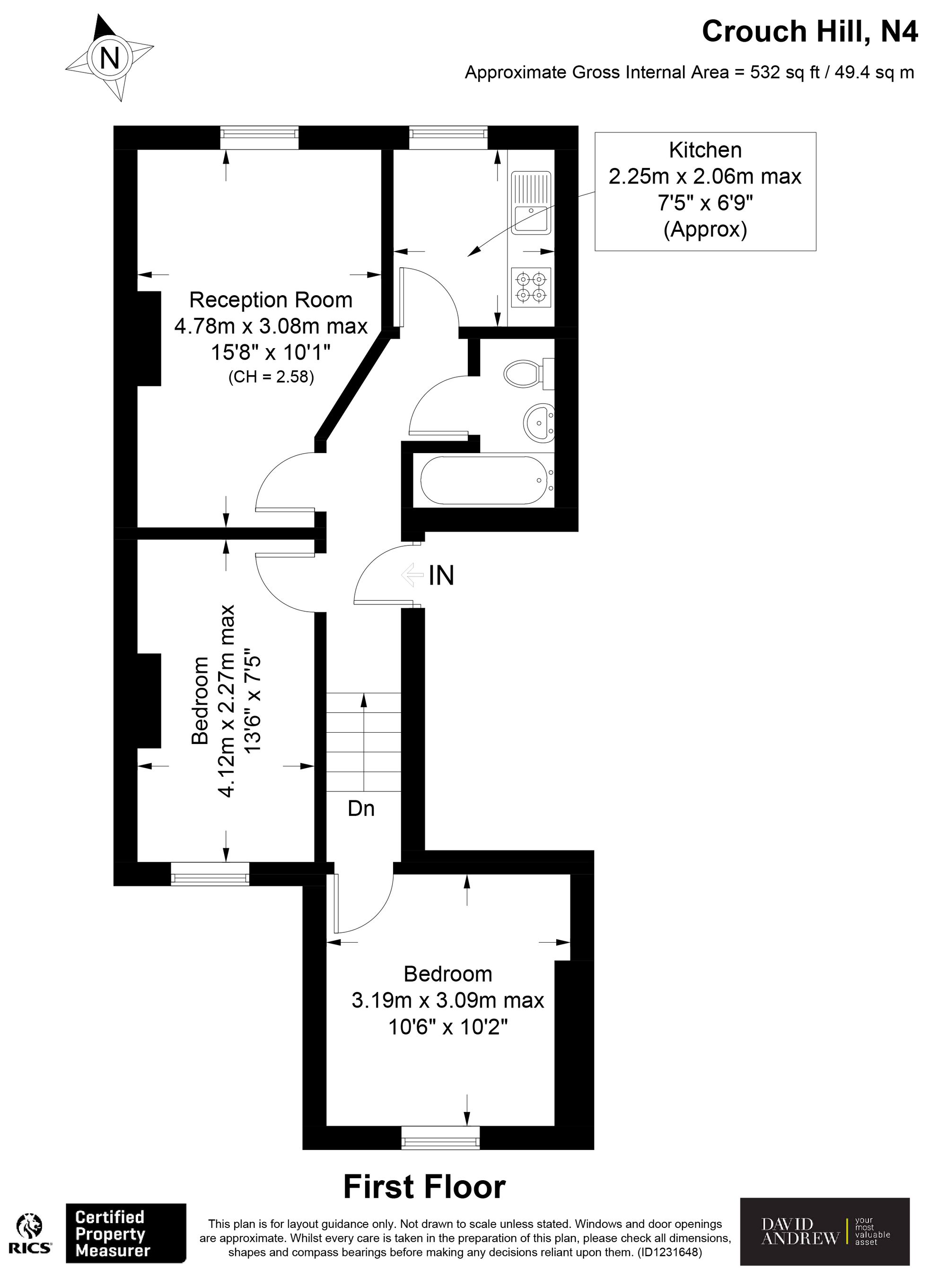Offered to the market chain free at a competitive price and arranged over the first floor of an attractive period building, this well-proportioned two-bedroom split-level apartment offers 532 sq. Ft. (49.4 m2) of versatile living space.Both bedrooms are positioned at the rear of the property with a desirable southerly-facing orientation, each comfortably accommodating a double bed. The reception room is light and airy, featuring a large double-glazed window overlooking the front aspect, spotlights to the ceiling, and shelving with ample space for a dining area.The separate kitchen is fitted with a range of white wall and base units complemented by a white tiled splashback, with plumbing for a washing machine, space for a freestanding oven/hob, a wall-mounted boiler, a small breakfast bar, wall-mounted shelving, and room for a large fridge-freezer.Adjacent to the kitchen is a white three-piece bathroom suite, comprising a WC, pedestal wash hand basin, and a shower-bath combination, with vanity mirror and shelving. The property is double-glazed throughout and holds an EPC rating of D.With scope for aesthetic improvement, this apartment offers a fantastic opportunity for first-time buyers or those seeking a strong rental investment in a location that continues to grow in popularity. Early viewing is highly advisable.EPC Rating: DLocationSuperbly positioned on Crouch Hill, the property is equidistant between the vibrant hubs of Finsbury Park and Crouch End, both offering an array of shops, bars, restaurants, and excellent transport links.Local highlights include the architectural landmark Old Dairy, with further amenities and independent retailers nearby. The area benefits from strong connectivity, making it a sought-after location for professionals and investors alike.This is an ideal opportunity to secure a home in a well-connected, thriving neighbourhood with a welcoming community atmosphere.
