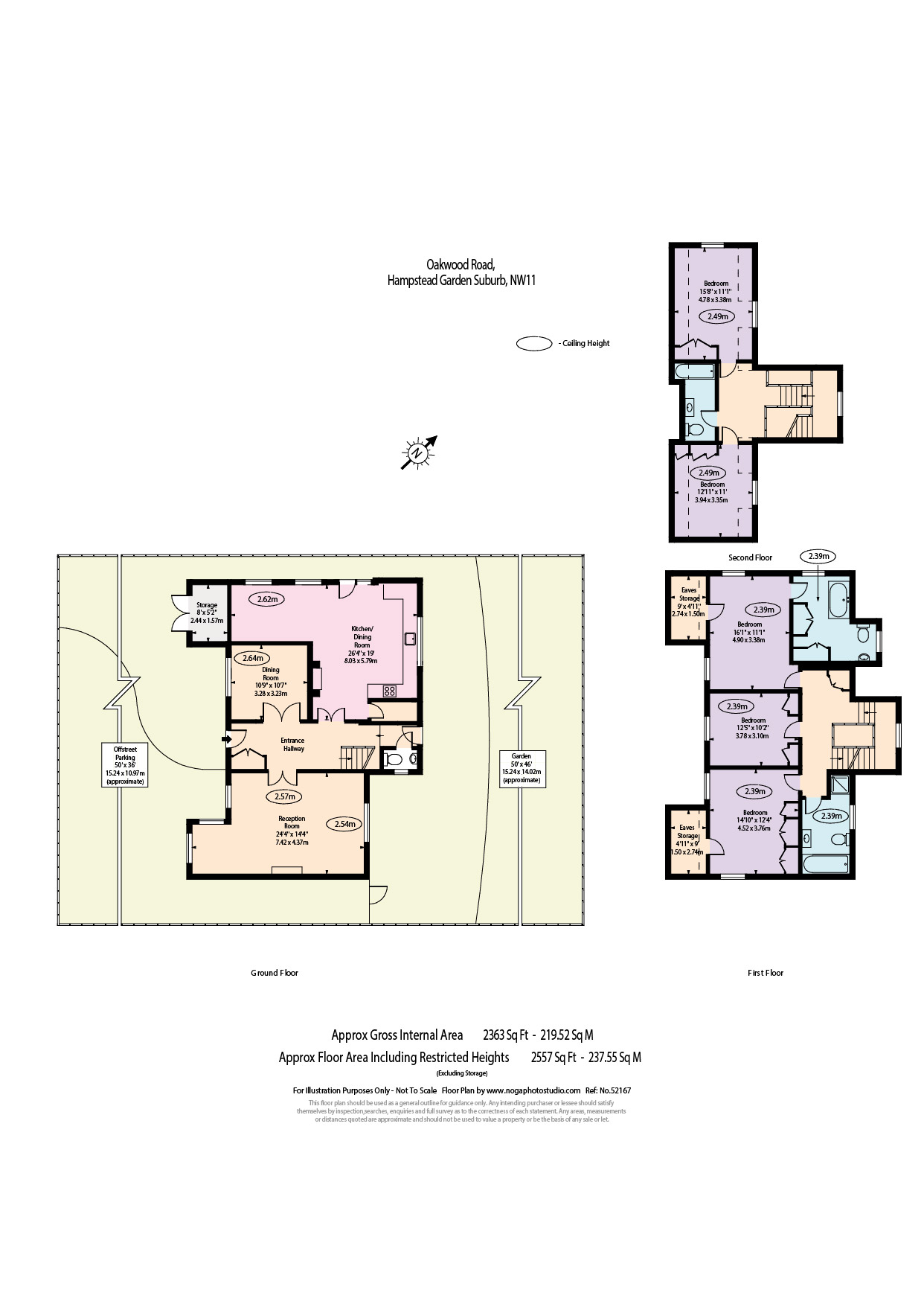 An impressive five bedroom detached house with off street parking for several cars, situated in this favoured tree lined street on the south side of the Suburb. Set back from the road behind a pretty front garden, this family home offers 2363 square feet of accommodation over three floors. Comprising a large entrancehall with double doors leading into a 24'4 reception room on one side and a dining room on the other, with a spacious eat in kitchen and family room, principal bedroom with en-suite bathroom, four further bedrooms, two further family bathrooms, guest cloakroom and a mature private rear garden with uninterrupted views. Oakwood Road is ideally located less than a minute to Big Wood Nature Reserve and only 0.3m to the amenities of Market Place.