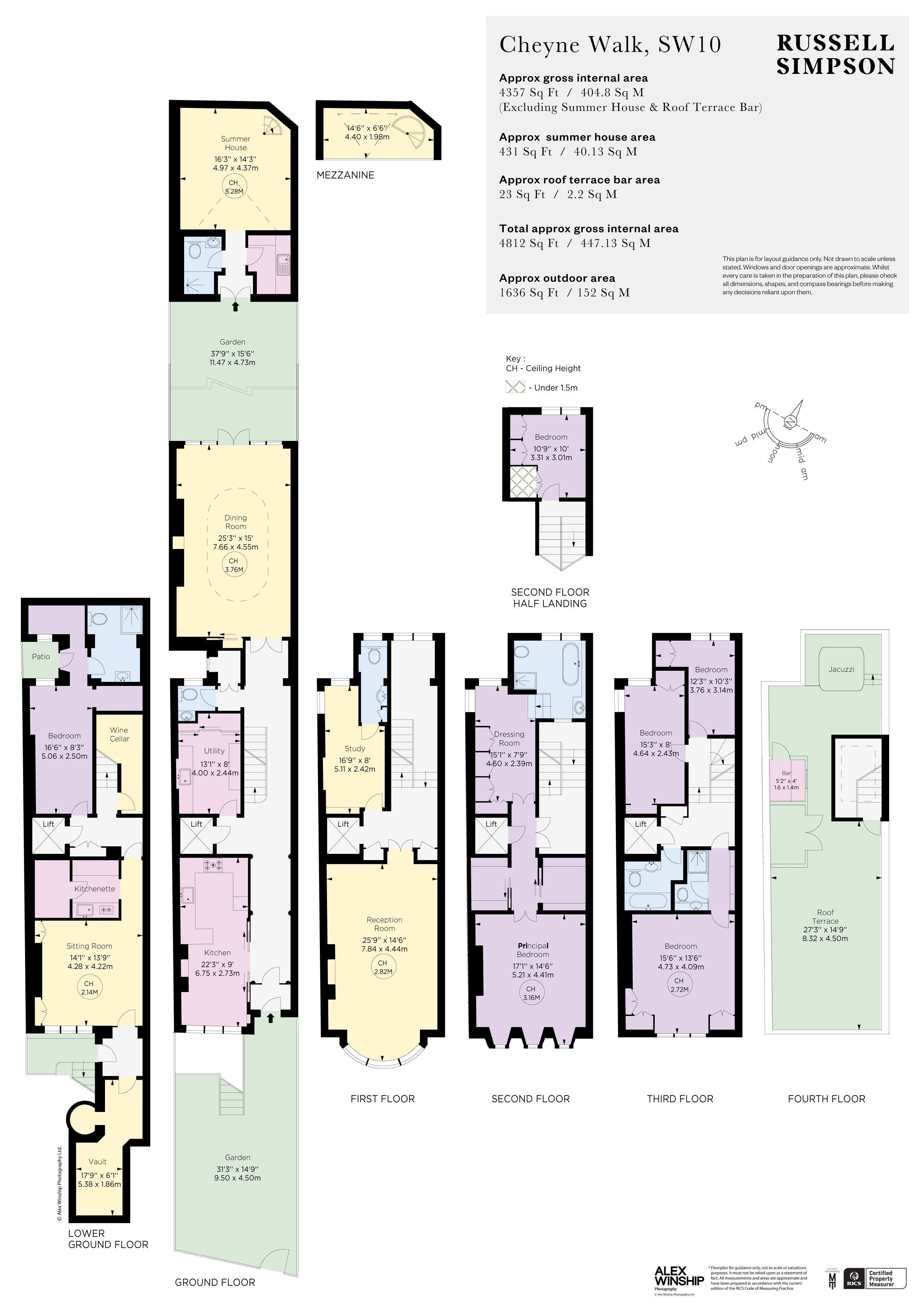 Elegant family home with summer house and lift on one of London’s most historic streetsStepping into the house on the raised ground floor via a secure gated entrance, the front hall opens onto a well-proportioned kitchen. This includes an informal breakfast area lit by a large south-facing window.At the end of the hallway lies a generous dining room in an opulent classical style. Three French doors open onto the garden, while a magnificent skylight floods this space with natural light. This floor also features a utility room and a guest WC.The lower ground floor can serve as a self-contained flat. It currently features a bedroom with an ensuite bathroom and patio access, a kitchenette and a second bedroom/reception room. This level also offers a wine cellar, a storage vault and separate street access.The first floor features an impressive drawing room with high ceilings and a rounded bay window overlooking the river. It also features a study and another guest WC.The second floor is entirely occupied by the magnificent principal suite. This includes a bathroom with a generous bath, a bright and tasteful bedroom, a dressing room and two further walk-in wardrobes.The third floor offers three more bedrooms and two more bathrooms, one of them ensuite. There is a final bedroom on the second floor half-landing.The beautiful interiors of the house have been well-preserved and the main living areas are decorated with a traditional sense of splendour. The property is unusual in not being listed, while a lift connects each level.The house includes an attractive rear garden with a dining area, a paved pathway and planted borders. It leads to a generous summer house or garden studio that can be used as guest suite, offering kitchen, bathroom, a living area and a mezzanine sleeping area. Meanwhile, two stylish contemporary skylights fill this space with light.Unusually for this street, the property benefits from a superb roof terrace. It includes a jacuzzi, an outdoor bar and a sheltered seating area with 360-degree views. From here, a wide stretch of the River Thames is visible, from Battersea Power Station to Chelsea Harbour and beyond.The house is also set back from the street with a front garden giving added privacy.Cheyne Walk is one of the most historic streets in London. Over the nineteenth and twentieth centuries, the street was home to numerous celebrated figures, including the writers George Eliot and Bertrand Russell, the painters Dante Gabriel Rossetti and J.M.W. Turner, the actress Elizabeth Taylor and the politician David Lloyd George. More recently it has been occupied by famous figures from business and the arts, as well as royalty.Today, the street is conveniently positioned. To the south is the Thames Embankment, with the Albert Bridge leading to Battersea Park. To the north is the King’s Road and its excellent range of restaurants and shops. In addition, the beautiful Chelsea Physic Garden is just a short walk away. Furthermore, Lindsey House, the oldest house in Kensington and Chelsea, is next door.