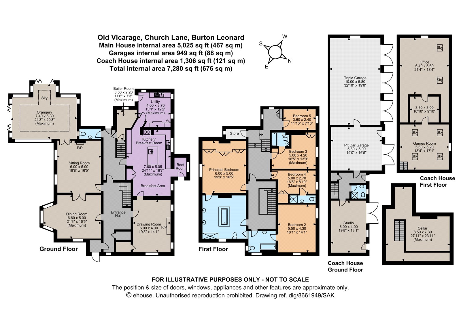 A handsome and generously proportioned period family home, built of red-clay brick with hues that vary from russet to autumnal browns, contrasting stone mullion windows and slate roof, it is a superb example of its type. It combines modern amenities and elegant décor that seamlessly blends traditional with present day.The propertyOld Vicarage offers a total internal area of 7,280 sq. Ft of light-filled, flexible accommodation arranged predominantly over two floors of the main house. The current owners have fully refurbished the property during their tenure and added a magnificent orangery. The whole has been configured to provide an elegant and practical, living and entertaining environment.The main entrance opens into a grand entrance hall with galleried landing above and leads to the ground floor accommodation. To the left is an impressive dining room that is the perfect space for hosting dinner parties, and for a more formal dining setting with its full-height side-aspect bay window and an abundance of space for a generous dining table. A set of French double doors continue through to the comfortable sitting room with feature fireplace, an ideal room to relax and unwind in, whilst being bathed in the warm southerly light from the two large sash windows. A further set of double doors with modern stained glass windows lead to the spectacular orangery with large, vaulted skylight and picture glazing that floods the room with plenty of natural day light throughout the day and affords views across the beautiful surrounding garden. Two sets of bi-fold doors open out to the paved terrace areas.Back across the entrance hall is the drawing room with a dual aspect and feature fireplace, it exudes a quiet elegance and is an ideal haven in which to withdraw after dinner and entertain. The country style kitchen/breakfast room has a range of Shaker-style wall and base units and a large central island with complementary worktops, a quarry tiled floor and an Aga. The breakfast area has ample space for a family dining table for a less formal dining experience. The breakfast area opens into a side boot room with garden access and a useful, neighbouring fitted utility room provides additional space for storage and appliances provides access to the rear terrace. Completing the ground floor access via the rear hall is a cloakroom and boiler room that has a concealed staircase which descends to a generous cellarage, suitable for storage or for converting to a wine cellar and tasting room.Stairs rise from both halls to interconnecting first-floor landings with the front hall landing featuring an opaque skylight. The substantial principal bedroom has fitted cabinetry and a spectacular en suite bathroom with twin sinks, a central freestanding claw bath, and a separate walk-in shower enclosure. There are three further double bedrooms with either en suite bathrooms or shower rooms and a smaller bedroom appropriate as a nursery or home study.Services: Mains electrics, gas, water and drainage. Solar panels with battery storage.OutsideThe property is approached through stone pillars and electric double iron gates over a gravelled driveway leading past the house to a block-paved rear courtyard, providing private parking for multiple vehicles and giving access to a heated triple garage with EV Charging point, and connecting double inspection pit, car garage.The latter has a door to the coach house, which provides a hallway with a separate entrance door, a shower room and a door to the studio with double doors out to the courtyard. Stairs rise to three inter-connecting first floor rooms, two currently used as an office and games rooms, Velux glazing in both providing plenty of natural light. The coach house has the potential to be converted into a self-contained annexe subject to the necessary planning consents which would be ideal for multi-generational living or for those with a dependant relative.The well-maintained part-walled garden surrounding the property is laid mainly to areas of lawn with a large vegetable garden with raised beds. It features a large wraparound paved terrace and a paved side terrace, both ideal for entertaining and al fresco dining. The whole is bordered by well-stocked shrub beds and mature trees creating a perfect scene of privacy and tranquillity.LocationThe sought-after village of Burton Leonard offers a good selection of day-to-day amenities including a village store, Post Office, public house and primary school together with a village hall, church and village green. There is a vibrant community feel to the village, with a variety of activities available for all ages and interests. Cultural and historical sites nearby include Newby Hall, rhs Harlow Carr and Fountains Abbey, whilst an excellent selection of countryside walks and rides can be found in the surrounding areas, with the Yorkshire Dales just a short drive away.The village benefits from easy access to nearby Harrogate, a Spa town popular as a base from which to explore the Yorkshire Dales and renowned for its shopping facilities including a shopping centre, an arcade and a wide range of independent retailers as well as Asda, Morrisons and Sainsbury’s supermarkets.The area boasts an excellent selection of state schools, many rated as Outstanding by Ofsted, alongside a number of notable independent schools.The nearby A1(M) ensures easy access to both the north and south of the country, as do the excellent links from Knaresborough train station which offers regular services to central London. With Leeds Bradford airport providing both domestic and international flights.