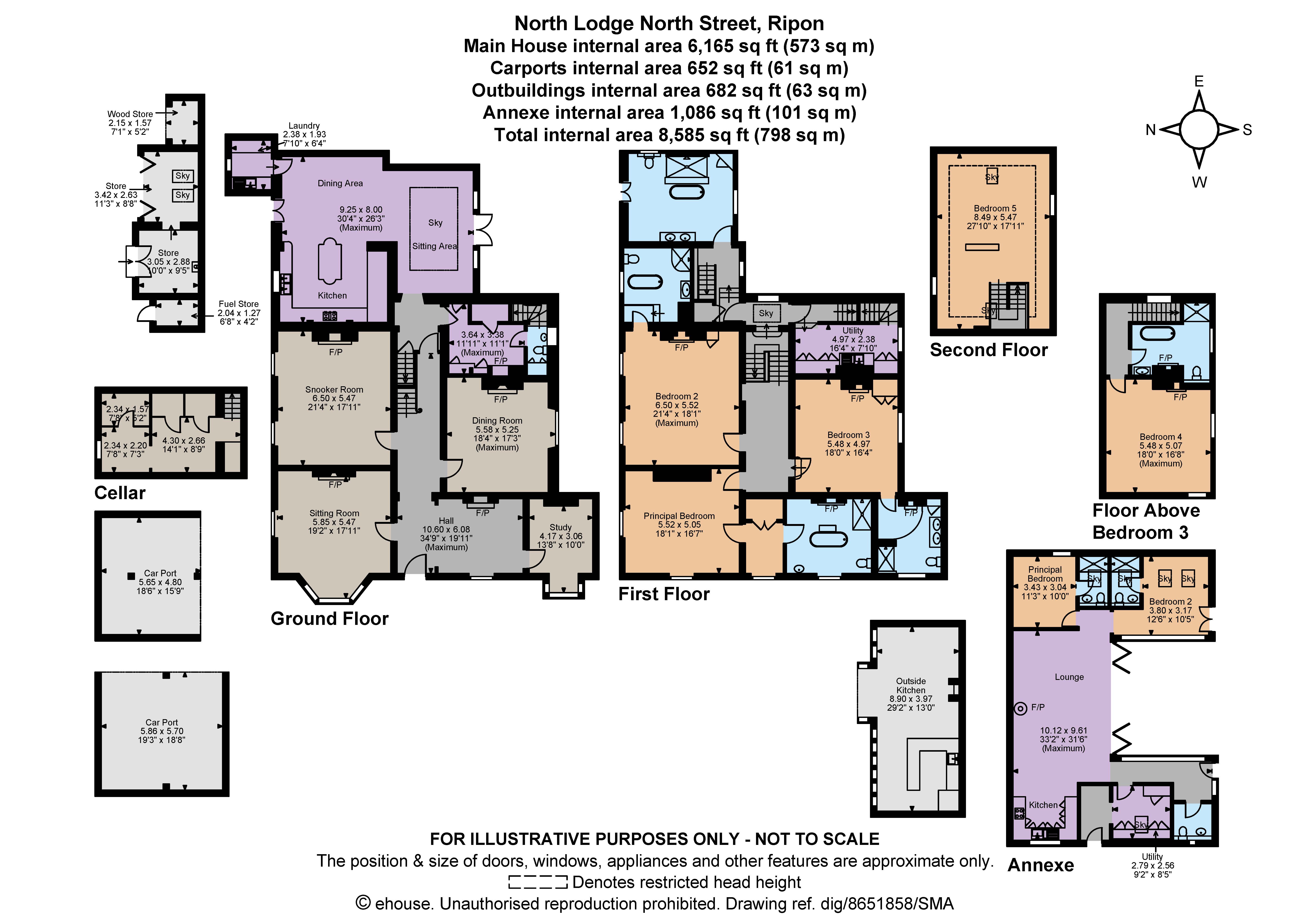 A fine five-bedroom period house with extensive, beautifully appointed accommodation and delightful spacious gardens, set in a highly sought-after position in the heart of Ripon’s historic city centre. The property features refined, elegant accommodation with a wealth of magnificent original details, while there is also a detached two-bedroom annexe and separate studio.The propertyNorth Lodge is a magnificent period house, dating back in part to 1725 and once the residence of the Earl de Grey, Marquis of Ripon. The property has undergone a programme of refurbishment during the current owners 16-year tenure, and boasts five bedrooms and stunning living space, set in a sought-after, very private and convenient position on the edge of Ripon’s historic city centre.The accommodation displays various elegant original details, including high ceilings, ornate cornicing and ceiling roses, large sash windows and handsome original fireplaces, alongside bespoke fittings and décor of the highest quality. The impressive reception hall provides a splendid welcome to the home, with its wooden parquet flooring and fireplace fitted with a woodburning stove. There is space for a seating area, while doors lead off the reception hall to the main ground-floor living and entertaining spaces. These include the sitting room at the front, which has an open fireplace, a chandelier light fitting and a dual aspect, including a tall sash bay window. There is also a formal dining room, a useful home study and a substantial games room with space for a billiards table. Towards the rear, the open-plan kitchen, dining area and sitting area provides further beautifully appointed living space, with the Orangery featuring a ceiling lantern skylight and French doors opening onto the rear gardens. The kitchen itself has Clarity Arts shaker-style, bespoke fitted units, a central island, integrated dishwasher and wine cooler and a stainless-steel Britannia gas range cooker. There is also a laundry, a utility room and a cellar, providing further storage and space for home appliances.On the first floor there are three luxury double bedrooms, each of which is en suite. These include the generous principal bedroom, which has a dressing room and an en suite bathroom with a roll-top bathtub and a large separate shower unit. One of the other first-floor bedrooms has an en suite bathroom, with the other featuring a shower room. Also, on the first floor there is a further utility/laundry room and a large family bathroom with a walk-in shower and a brass bathtub. There are separate staircases leading to the fourth and fifth bedrooms, one f which also leads to a further bathroom.AnnexeThe detached annexe, built in 2018 provides more than 1,000 square feet of additional modern accommodation, making it ideal for use as a rental property, of for multi-generational family living. It includes a 33ft open-plan sitting room with log burner and kitchen with built-in oven and induction hob and fridge freezer, a utility room and two double bedrooms, both of which with en suite shower rooms and built in wardrobes, all enjoying underfloor heating. Bi-fold doors open to a private courtyard patio area with a double carport nearby.Services: Mains electricity, gas, water and drainageThe house is set back from the road along a driveway, which leads to the gated entrance, providing access to the main house, the annexe and the detached carports for covered parking. The extensive gardens include patios and gravel terracing to both the main house and the annexe, as well as a pristine lawn with borders of established trees, shrubs, hedgerows and pond. A detached brick building offers the opportunity to create a studio, office or gym. There is also an outdoor kitchen which is ideal for entertaining and dining al fresco, with a pizza oven, open fire and bar area.The property is located in a highly sought-after location, just moments from the centre of the historic cathedral city of Ripon. The city has plenty of character and charm, with plenty of historic buildings, while the centre has a variety of shops, amenities and leisure facilities. There are several outstanding schools in Ripon, including the Ripon Grammar School and Outwood Academy, plus St. Wilfrid’s Catholic Primary School, as well as a number of independent schools.The stunning North Yorkshire countryside is within easy reach, with the Nidderdale Area of Outstanding Natural Beauty, the Yorkshire Dales National Park and the North York Moors providing a breathtaking setting for walking, cycling and riding. The area is well connected by road, with the A1(M) close-at-hand, while there are mainline rail services available from Harrogate or Thirsk.
