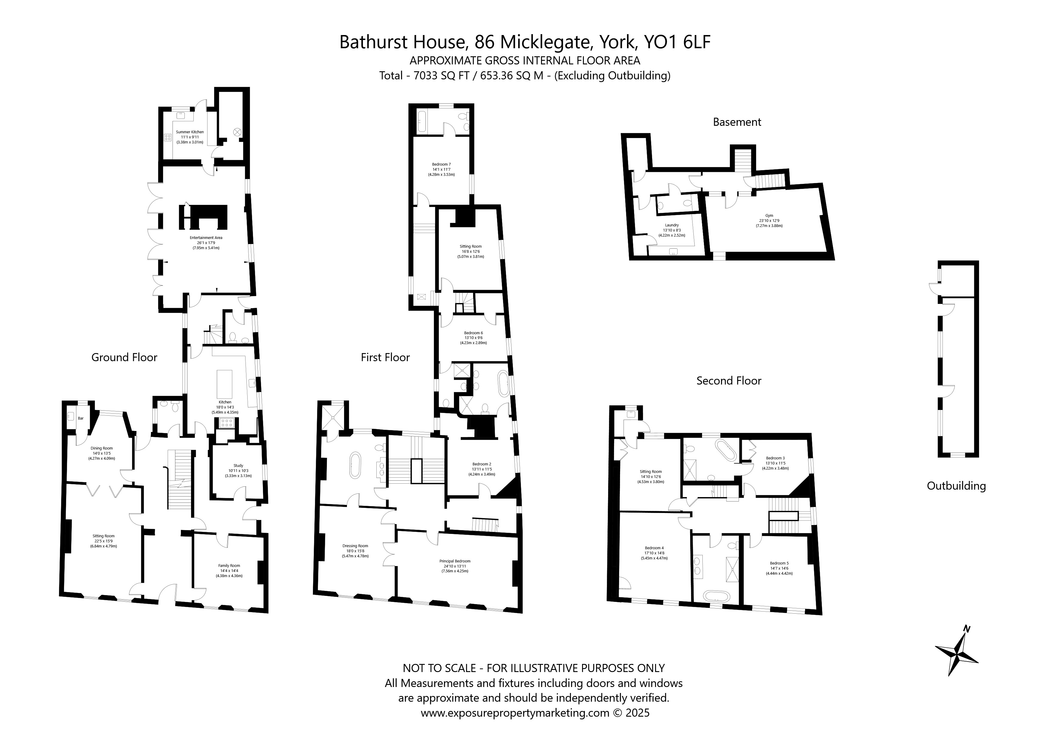 An exceptional Grade II* listed Georgian residence offering over 7,000 sq ft of elegant and versatile accommodation with a guest suite, and private walled gardenDescriptionBathurst House is a fine example of early 18th-century architecture, occupying a prominent position on the south side of the River Ouse. Set behind a handsome double-fronted façade with Roman Doric door surround, this remarkable home combines architectural grandeur with sympathetic modernisation, the result of an extensive seven-year restoration programme that has reinstated the building as a distinguished private residence. A testament to the owners vision, the property has undergone a meticulous and extensive refurbishment offering a unique blend of traditional character and modern luxury. This exceptional property boasts original features such as wooden beams, adding to its historic charm and character.Constructed in the 1720s and extended in the 19th century, the house bears close association with York’s civic and architectural heritage. Originally commissioned by Charles Bathurst, whose crest remains visible in decorative interior mouldings and cast-iron downpipes - the property has served various functions through the centuries, including as a hotel and later commercial offices. Bathurst House has undergone a comprehensive renovation, including full re-wiring and re-plumbing, new heating with 47 cast-iron Hurlingham radiators, underfloor heating to kitchens, bathrooms and basement, refurbished original windows with secondary glazing, and new bespoke kitchens and bathrooms throughout. Each upgrade has been undertaken with respect to the property’s heritage, and in line with a Georgian palette and aesthetic. Today, it stands as a meticulously restored private home with a rare combination of history, scale and discretion.Internally, the accommodation is arranged over four principal floors, displaying a wealth of original period detailing, including ornate ceiling cornices, dado panelling, fielded oak doors, sash windows with working shutters, and fine fireplaces throughout. The grand entrance hall features original Victorian tiled flooring and a spectacular sweeping staircase with alternating fluted and twisted balusters rising beneath a coffered ceiling bearing the Bathurst crest. A 40-pane arched stair window offers a striking view across the private walled garden.The principal reception rooms retain their elegance and proportion, notably the 36 ft double drawing and dining room - ideal for formal entertaining and complete with parquet flooring, folding doors, and a concealed corner bar with leather-finish granite worktops and Quooker tap.The handmade kitchen, crafted by Hovingham Interiors, links the main house with the guest suite and features an island unit, granite work surfaces, range cooker and integrated Neff appliances. A south-west aspect and tall windows ensure a bright and inviting space with views to the garden. Additional living spaces include a study, cinema/gym, wine store and generous utility areas at lower ground level, enhancing the flexibility of the accommodation.The first floor is home to a luxurious principal suite extending across the front and side elevations, comprising a spacious bedroom, bespoke dressing room and an opulent en suite bathroom complete with Samuel Heath freestanding copper bath, rainhead shower, and bespoke vanity. Further bedrooms are generously proportioned and beautifully appointed across the upper floors, including a second suite with original panelling and fireplace, and a top floor sitting room with discreet kitchenette, perfect for guests or children. A staircase leads to a private roof terrace spanning the width of the house, offering a rare outdoor retreat in the city centre.The two-storey guest suite, formerly the service wing, remains fully integrated with the main house yet is self-contained, which would be ideal for multi-generational living and has independent access from Barker Lane. Comprising a kitchen, sitting room, three bedrooms and two bathrooms, it presents a valuable opportunity for guest, multi-generational or staff accommodation.OutsideThe walled garden offers rare privacy and seclusion, beautifully landscaped with mature planting, lawn and extensive paved terraces ideal for outdoor entertaining. A traditional brick outbuilding with pantile roof provides useful storage. The garden is accessed from the lane via a secure rear gate.LocationMicklegate is most famous for Micklegate Bar, one of the four main gateways in the York city walls. It historically served as the main entrance for travellers from the south and held ceremonial importance, requiring monarchs to dismount and seek permission to enter.The property is perfectly positioned just inside the city’s historic walls on Micklegate with all the popular attractions nearby including: York Theatre Royal, the Art Gallery, York Minster, Bettys Tea Rooms and the famous Shambles along with a range of local cafes, shops, restaurants, public houses and supermarkets.The city boasts excellent restaurants including the award winning The Star Inn the City by Andrew Pern and the Michelin-starred restaurant, Roots, by Tommy Banks. In addition, there is Skosh by Neil Bentinck which also boasts a Michelin-star, positioned on Micklegate and there are a number of independent shops, pubs, cafes, hairdressers and a post office.Bishopthorpe Road, about half a mile away, is a highly popular area of York and has won the "Great British High Street of the Year" award in 2015, as well as being voted "one of the UK's coolest places to live" by The Times. The area has a well-known parade of independent shops, café-delis, bakeries, supermarkets and restaurants which host regular events and festivals.Rowntree Park with a café is less than a mile away and has a playground, tennis and basketball courts. Located beside the River Ouse is York City Rowing Club and York Pilates Space.The well-known York Racecourse and Knav