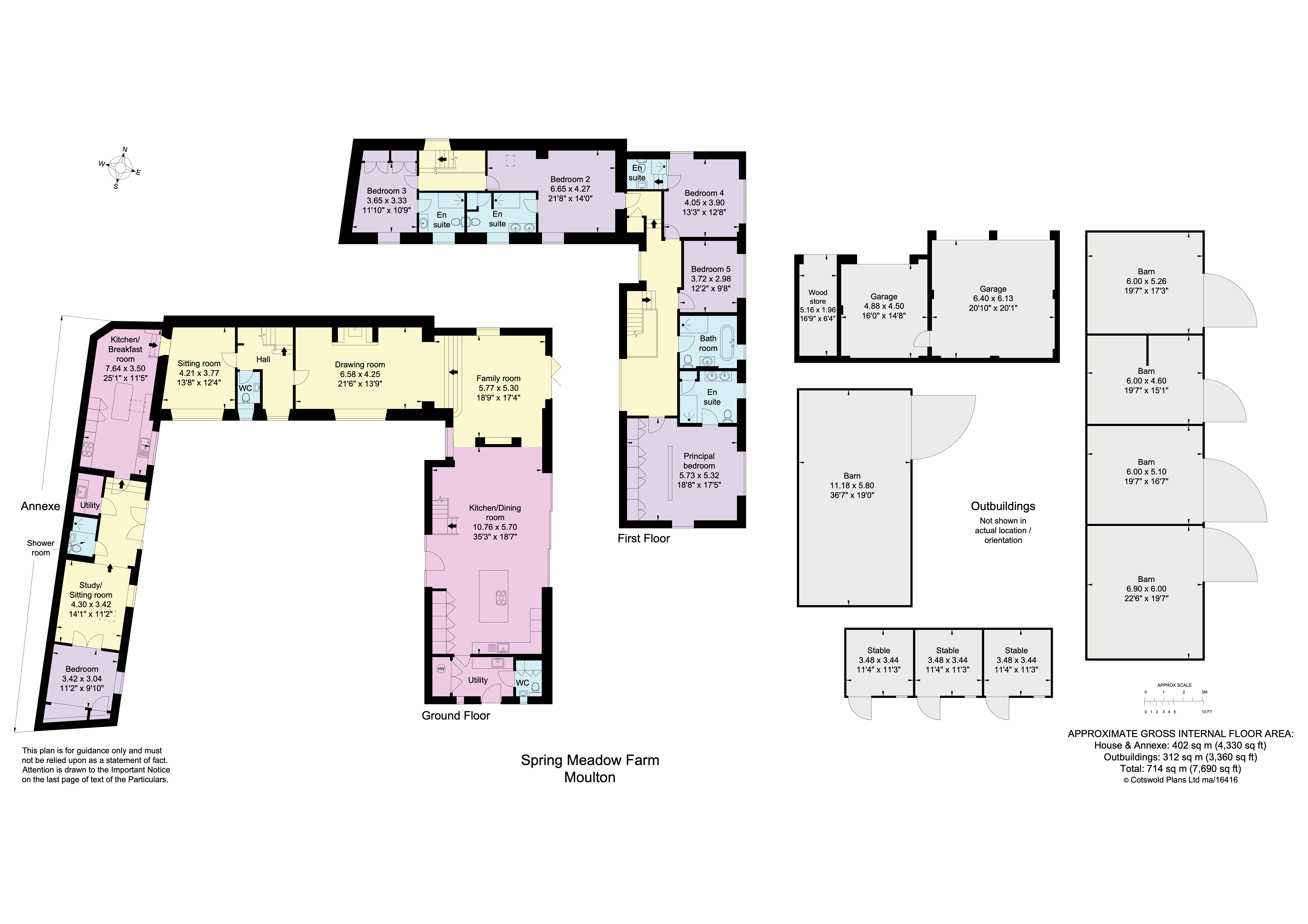 Spring Meadow Farm has been most beautifully restored and extended by the present owner to provide a high-quality, stylish home, with good energy efficiency and great attention to detail, with top-quality fittings and finishes, built in stone with a Thermo hard-wood clad contemporary wing.The house is built around a south-facing courtyard and terrace, with a west wing that is designed to form part of the accommodation, but also as a self-contained annexe for extended family. The house is full of character, built in stone and brick under a slate roof, with timber frame double-glazed windows and oak doors. Integrated blinds, under-floor heating and lighting which can be remotely controlled, electric, flame-effect fires.The accommodation flows seamlessly from the superb main kitchen/dining room, with its tiled floor, mood lighting, oak and glass staircase and wide sliding doors to the courtyard and to the east-facing patio, beautifully fitted kitchen with new integrated appliances and large island with breakfast bar, Bora hob. Utility room including up to date plant room servicing the state of the art water purification unit and back WC beyond. The kitchen flows into the family room with wide electric flame-effect fire under a large screen built-in TV, bifold doors to the patio and steps up to the drawing room dominated by a large ironstone chimney breast housing a wood-burning stove.Stair hall with second staircase rising to the back landing and cloakroom with WC. Sitting room with two panelled walls and hard flooring and access into the west wing.The west wing has its own entrance hall, sitting room and ground-floor bedroom, shower room and utility room, with a fully fitted kitchen/breakfast room with painted timber range of kitchen units with timber tops and integrated appliances, limestone tiled floor and island unit.To the first floor, the main gallery landing, glass and chrome balustrade and wide west-facing windows lead to the principal bedroom with a dressing area with extensive wardrobes behind a free-standing bedhead, allowing the room to take full advantage of the south and east-facing views and luxurious en suite shower room. There are four further double bedrooms, three with stylish shower rooms and a Lusso family bathroom.OutsideThe property is approached off the very quiet Spectacle Lane through a pair of electric five-bar gates to a gravelled drive and parking area, with a timber garage block, a triple garage with electric doors and wood store.The courtyard, with two shrub/flower beds, screened by a stone wall hiding the bin store and service area, leads to the house and steps up to a wide paved terrace, ideal for outdoor sitting and relaxing. To the east side of the house, off the kitchen, is a paved patio and stone walling designed for enjoying the morning sun with breakfast or a morning coffee, with a lawn beyond with mature trees to the paddock beyond.Stable yard with post and rail fencing and three wooden stables.A second access off the lane accesses the lower yard with an enclosed barn, ample hardstanding for additional parking and storage and a further farm building divided into four sections suitable for livestock housing or machinery stores and workshops. The paddock extends to about 4 acres with a pond at the far end providing grazing and protection for the property, with a mature hedge to the south boundary.The property is situated on Spectacle Lane, an unmade lane to the north of the village, surrounded by open fields and with views to the village. The property sits between Pitsford village with its excellent offsted rated independent Pitsford school and scenic Pitsford Reservoir and Moulton village, as well as an array of many other sought after villages nearby including Althorp and Maidwell. Moulton is a large village just north of Northampton and has pre-school facilities, primary and secondary schools, and is the home of Moulton College agricultural and equestrian college.Moulton Parish Council won the Local Council Award Scheme Gold in 2024. The village has an annual festival. There is a parish church, Moulton theatre, community centre and café, shop, public houses and parks.Horseracing at Warwick and Stratford-upon-Avon, motor racing at Silverstone, theatres at Northampton and Milton Keynes.In the area, there is a wide range of state and private schools to suit most requirements, including Northampton High School and Spratton, Little Houghton and Kimbolton preparatory schools; Stowe, Rugby, Oundle, Oakham and Uppingham Public schools.Northampton town centre 5 miles (Intercity mainline trains to London Euston and Birmingham), Wellingborough 10 miles (Intercity trains to London St Pancras and Nottingham), M1 (J15A) 7 miles, M6 18 miles, Market Harborough 15 miles, Towcester 13 miles, Daventry 16 miles, Milton Keynes 26 miles (distances and times approximate).
