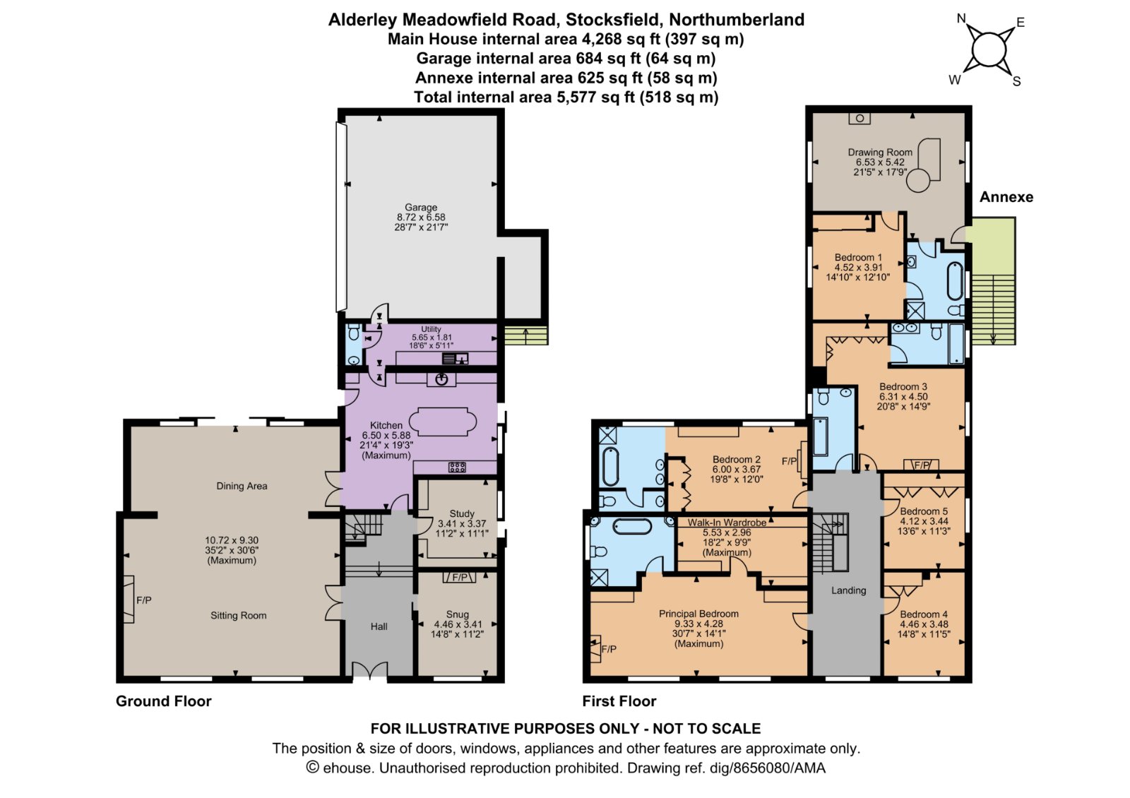 Set in the exclusive Painshawfield Estate, and sensitively extended by the vendor, Alderley offers 4,902 sq ft of light-filled, flexible accommodation arranged over two floors. Providing an elegant and practical living and entertaining environment, the accommodation flows from a welcoming split-level reception hall. It briefly comprises a snug with a fireplace, a study with bespoke fitted shelving and patio doors to the side terrace, and an open plan sitting and dining room. The sitting room has a fireplace, while the dining area has space for a large table and full-height glazing incorporating patio doors to the rear terrace. Double doors open from the dining area to an L-shaped kitchen/breakfast room, also accessible from the hallway. It has a range of bespoke wall and base units, a large central island, modern integrated appliances, space for a table, a door to the rear terrace and patio doors to the side terrace. A door opens to a fitted utility room with en suite cloakroom and access to the integral garage.On the first floor, the property offers a principal bedroom with a mirrored feature fireplace, fitted storage, a walk-in wardrobe and an en suite bathroom with two sinks, freestanding bath and separate shower. There are four further bedrooms, all with fitted storage. Two of them have fireplaces and en suite bathrooms, both with twin sinks and one with a chromed freestanding bath. A contemporary family bathroom completes the primary first floor accommodation.The property further benefits from a self-contained first floor annexe situated above the garage and accessible via steps from the side terrace. It provides a drawing room with freestanding wood burner effect Dimplex fire and a bespoke-fitted kitchen area with a large central island, together with a bedroom with Jack and Jill access to a bathroom with freestanding bath and separate shower, also accessible from the drawing room.Set behind rendered high walling, the property is approached through double pillared electrically operated iron gates over a gravelled driveway with turning circle, providing private parking and continuing to the integral triple garage to the rear. The well-maintained gardens surrounding the property are laid mainly to grass with a chamomile lawn bordered by well-stocked flower and shrub beds and a wealth of mature trees. It features numerous seating areas and large paved rear and wraparound side terraces, the whole ideal for entertaining and terrace suppers. At just under 1.5 acres, this is one of the largest plots on Meadowfield Road.Stocksfield village offers a good range of amenities including two Post Offices, a community centre, petrol station, Spar, convenience store, newsagent, garage, butcher, gp surgery, chemist, vet, two hairdressers and a first school together with cricket, tennis and golf clubs. Separated from the village by the River Tyne, Bywell village sits near to Cycle Route 72 and the river’s famed salmon loch and is also home to the annual Northumberland County Show. Hexham and Newcastle offer more comprehensive cultural, recreational, medical and shopping facilities. Whilst the ancient Roman village of Corbridge is just over 6 miles to the west and has a good range of independent boutique retailers, a fantastic delicatessen, butchers and a range of pubs and good eateries. Communication links are excellent: The A68 and A69 link to major regional centres, the beautiful Northumbrian coastline and the A1, Stocksfield station (1.6 miles) offers regular services to Hexham, Newcastle, Carlisle and London and Newcastle International Airport provides domestic and international flights.The area offers a good range of state primary, secondary and grammar schooling together with independent schools including Mowden Hall, Delta, Dame Allan’s, Westfield, Newcastle School for Boys, Newcastle High School for Girls and Royal Grammar School.