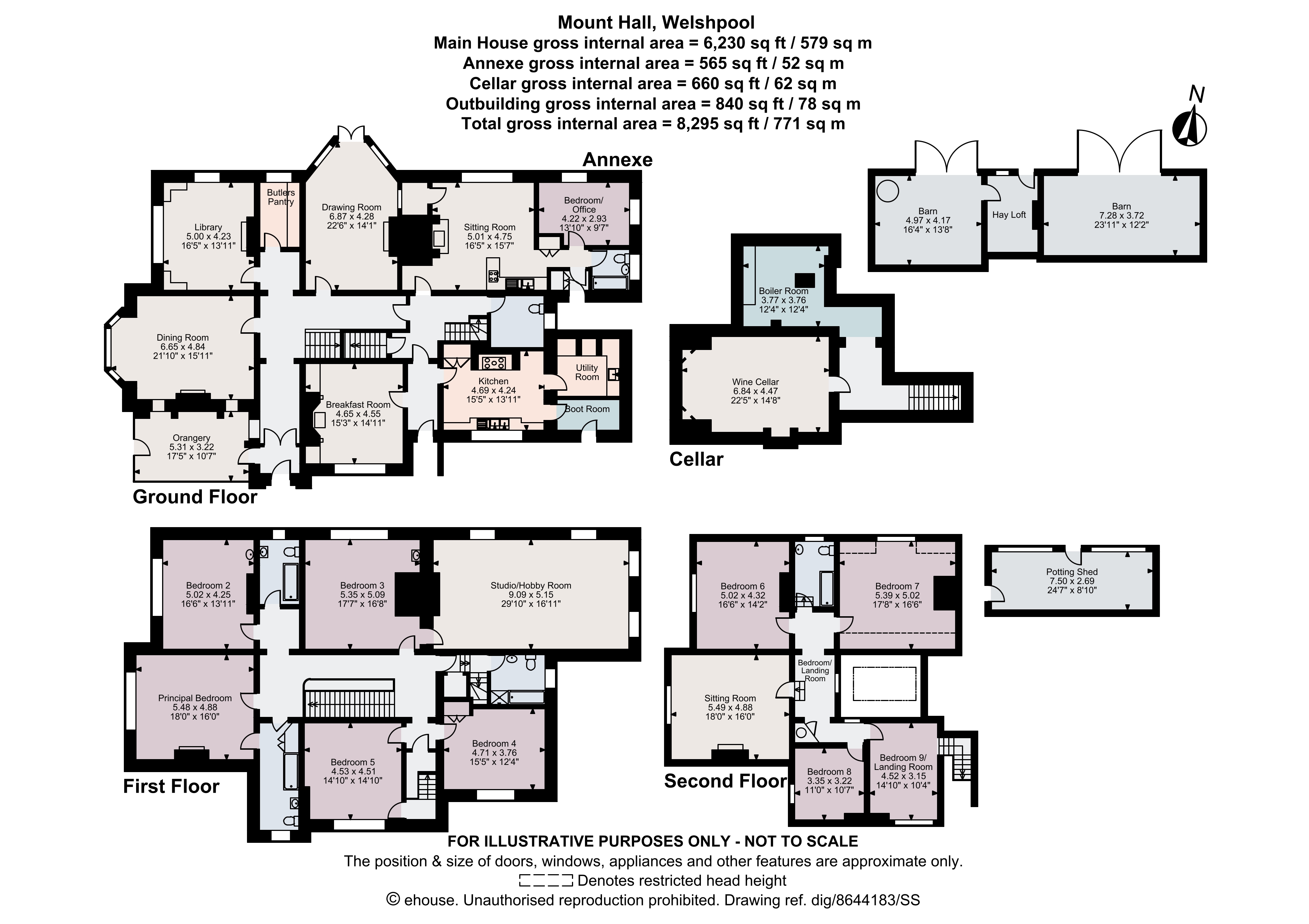An extremely handsome Victorian villa, surrounded by wood and pastureland and situated in an elevated position with far-reaching views towards the Welsh mountains, in all about 10 acres.DescriptionMount Hall is an extremely handsome Victorian villa, which dates back to 1873 and was for many years the home of Edward Pickmere who as Town Clerk of Liverpool was associated with the building of the Vyrnwy dam. It is constructed of dressed stone, with paired and triplet window frames in red and yellow banded sandstone, under a tiled slate roof. The house is a wonderful family home offering a mix of formal and informal reception space and is perfect for entertaining.On arrival at the property you are immediately met with fabulous and extensive views. Being elevated, the house takes in all of its surroundings and sits proud within its grounds of about 10 acres.The imposing front door is surrounded by a sandstone arch and leads into a mosaic tiled vestibule with a door on the left to the glazed orangery (a replica of the original 1873 orangery). There is a feature sandstone wall and a door leading outside on to the gardens and driveway. Mimosa, jasmine, citrus and other plants thrive here and it's a perfect place to relax in the sun, especially in the cooler months of the year.Double doors lead into the grand entrance hall which is "L" shaped with mosaic tiled floor and oak floorboards.The spacious dining room is high ceilinged with decorative plaster coving and cornice and a large fireplace with black marble surround. There is a south-facing bay window and additional windows facing the orangery. It is a perfect room for entertaining on a large scale. The butler's pantry with original glass fronted pitch pine cupboards is nearby and currently serves as a small office.The library has south and west-facing windows, a coved ceiling and custom-built hardwood bookcases on three walls. There is a non-working fireplace with white marble surround.The drawing room has a coved ceiling, plaster beams and a fascinating fireplace with a Derbyshire fossil limestone surround. There are floor to ceiling windows either side of double French doors which open on to the raised stone terrace and gardens. The terrace provides a viewpoint for watching croquet matches on the lawn, for scenic views to the west and for dining and entertaining.Off the entrance hall, is a door into an inner hallway leading into a sitting room with sash windows and a wood burning stove which is currently being used as an integral annex. Within the sitting room is a kitchenette and access to a bedroom and bathroom. A small lobby has a door leading outside to the back of the house. This could work well for multi-generational use or for those who are less able-bodied. This part of the house was rebuilt in 2000 using the original stone and sandstone.There is a cloakroom off the inner hallway and stairs leading to the first floor. The breakfast room and kitchen are either side of the mosiac tiled floor and from here a door leads outside to the front of the property. The breakfast room has a slate tiled floor and oil burning stove within the original old range surround. There are built-in cupboards and shelves under arched recesses. The kitchen has slate tiled flooring and a number of fitted bespoke, wall and base units, a sink, and a Britannia range cooker with an electric oven and a gas hob. The kitchen offers access into two separate rooms; a boot room with a door leading outside, and a utility and laundry room which has fitted units, a Belfast sink and slate tiled flooring.There is a further door leading to two large cellars, one of which has the oil fired boiler.The beautiful staircase glides from the entrance hall to the first-floor landing. There is a large ceiling lantern allowing plenty of natural light, decorative plaster coving and cornice, ornamental pillars and oak floorboards.Three further steps lead to the spacious principal bedroom which has a high ceiling with decorative coving. There is a fireplace with a light grey marble surround and wonderful views through the large window. It has an ensuite bathroom with a built-in airing cupboard. There are four further double bedrooms on this floor. Bedroom two is next to the principal bedroom and has windows facing south and west and an adjacent bathroom. Bedroom three is a spacious room with a large window facing west and a balcony.From bedroom three there is access to an enormous studio and hobby room which is above the annex. This could serve as further bedroom accommodation or as a first floor to the annex below. There is a further separate bathroom with a bath and shower. Bedroom four is a smaller room which makes a delightful children's bedroom. Bedroom five has decorative coving and large window.There is a staircase leading from here to the second floor where there are five rooms and a bathroom. Beyond the landing bedroom, a hallway leads to two double bedrooms, a smaller bedroom suitable for a child and up two steps, at the very top of the house, a large den/sitting room with wooden trusses, an attractive copper surrounded fireplace and of course a view!OutsideA long tree-lined drive provides a secluded setting for the property. On arrival at the house (situated at a height of 169 meters) you are immediately met with extensive views of the surrounding countryside and distant mountains. From the front of the house, a pathway leads to the large lawn area which is flanked to the south by a shrubbery with rhododendrons, azaleas, magnolia, roses and other flowering shrubs and to the north by rhododendrons, azaleas, and heather.Beyond the lawn, a pretty woodland walk runs along the edge of a beech wood covered with bluebells in Spring. The path leads to Pear Tree Lane and from here on to Llanfair Caereinion. In addition to some very large beech and oak trees in the woods, a variety of trees have been planted over the years in the field area, including Wellingtonia, Cedar, Horse Chestnut,