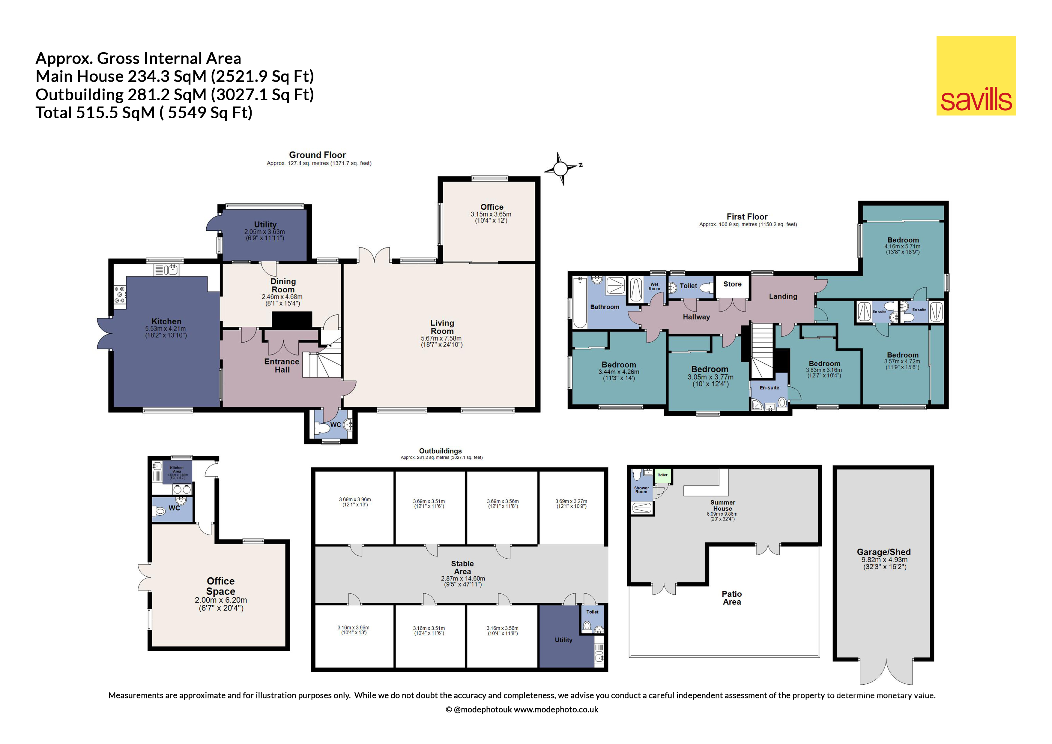 Attractive detached family home with a selection of outbuildings and equestrian facilities, occupying grounds of about 9.2 acres between the Stour and Colne Valleys.DescriptionHighlands is an established detached family home from the 1960s, set in a private location on elevated grounds between the Stour and Colne Valleys. This exceptional property offers a unique lifestyle opportunity, featuring an extensive array of equestrian facilities, a separate office and a beautifully designed summer house. The house is tucked away from the country lane, surrounded by about 9.2 acres of gardens and grounds.Built in traditional brick, Highlands is spread over two storeys and spans approximately 2,500 square feet. The home is filled with natural light and boasts five bedrooms on the first floor along with generously sized reception rooms on the ground floor.Upon entering, you are greeted by a welcoming reception hall with a turning staircase leading to the upper level. The kitchen/breakfast room, located on the side of the house, opens out to the garden, linking the indoor and outdoor spaces. The kitchen is well equipped with an array of units and features a central breakfast bar. Additionally, the ground floor includes a dining room, a practical utility room and a spacious dual-aspect living room that opens into a home office.Upstairs, the first floor offers five bedrooms, a family bathroom and a separate WC. The principal bedroom, along with the guest room and a third bedroom, all benefit from en suite facilities.Adjacent to the house is a detached office building complete with a kitchenette and WC, providing an ideal space for remote working. At the rear of the garden, the modern summerhouse offers an exceptional space for entertaining, featuring a fitted bar and a shower room - designed to blend with the surrounding garden.Highlands also comes with the added benefit of approved planning permission from Suffolk District Council for the construction of two holiday let cottages and an annexe, which would be located to the north of the property under application number(ref/200018). This enhances the potential of the property, offering further opportunities for expansion or income generation.The property is set back from a quiet country lane, approached via a sweeping driveway that leads to the front of the house.Situated at the centre of its 9.2-acre triangular plot, the house is surrounded by formal gardens, with the paddocks extending either side. A natural stone terrace surrounds the rear of the house opening to lawn. Adjacent to the terrace is a detached office, complete with kitchenette and WC facilities, providing a practical, yet secluded space to work from home. At the far end of the garden is a beautiful bespoke summerhouse, offering space for leisure and entertainment.Beyond the gardens, Highlands features a private yard dedicated to equestrian pursuits with power and water connected. The facilities include a timber framed stable block comprising nine loose boxes. Additionally, there is a separate agricultural barn, constructed in 2022, providing six stables, a tack room with a wash-down area, WC and ample storage for feed and equipment, with additional storage behind. A horse walker is also available, along with further two timber framed stables in the field.OutsideThe paddocks, extending from the north and south of the house, are divided into individual sections, offering well-maintained spaces for grazing and exercise, along with a 30 x 50m ménage. These paddocks, alongside the equestrian facilities, make this property an ideal opportunity for horse enthusiasts, or those looking for natural protection.ServicesMains electricity and water. Private drainage, non-compliant system.LocationNestled between the Stour and Colne Valley, this charming property is situated on the edge of Mount Bures, on the Essex/Suffolk borders, offering the blend of countryside living and convenient access to amenities.Despite its rural setting, the property benefits from excellent transport links, with the nearest train station being Chappel & Wakes Colne approx. 1.4 miles away. The journey to London Liverpool Street takes approximately 60 minutes, making it feasible for commuting, while Marks Tey can be reached in around 6 minutes.Mount Bures, around a mile away, is a charming village with a close-knit community feel. The local pub, The Thatchers Arms, is a focal point of the village.For families, the area offers a selection of well-regarded schools within easy reach, catering to all age groups. Primary and secondary schools in nearby Sudbury and Colchester offer education facilities, and there are also private school options in the wider area.The market town of Sudbury is just 7.5 miles away, providing a range of shops, supermarkets and recreational facilities. Colchester, Britain’s oldest recorded town, is also easily accessible and offers a wider array of shopping, dining and entertainment options, as well as a rich history, including Colchester Castle and the Roman Wall.The surrounding countryside provides a network of public footpaths. The area is also ideal for horse riders, with numerous hacking routes that weave through peaceful woodlands and open fields, providing both novice and experienced riders trails to enjoy.Square Footage: 2,521 sq ftAcreage:9.27 AcresDirectionsWhat3Words: ///cared.domain.resonates