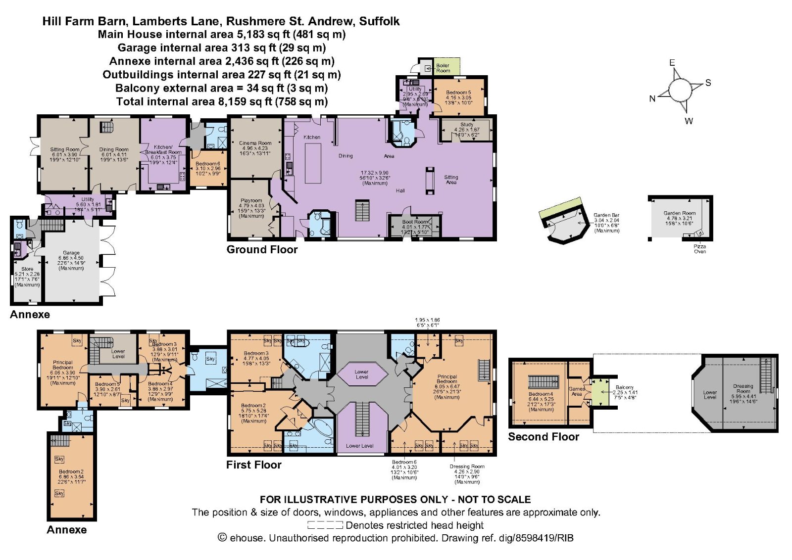 Positioned on the outskirts of the attractive village of Rushmere St. Andrew, Hill Farm Barn is an impressive barn conversion offering light accommodation throughout combining period and modern features, with a separate annexe, enjoying beautiful countryside views.The ground floor accommodation is easily accessed via the open plan area benefitting of beautifully exposed beams and brick where a kitchen can be found, fitted with bespoke cabinetry and feature breakfast island and doors leading to the rear gardens, as well as a dining area with double height windows with views over the rear paved terrace and a sitting area, ideal for family entertaining. The whole is being open plan creating the perfect modern family living area. Further on this floor there is a playroom and a cinema room, a useful study ideal for those working from home as well as a double aspect bedroom with views to the gardens. Completing the ground floor are two family bathrooms, a boot room and a utility room.On the first floor is the spectacular vaulted glass galleried landing, giving access to the four bedrooms, one of which is a principal bedroom with dressing room, as well as two bathrooms and a cloakroom; whilst on the second floor there is an additional bedroom and games area which leads to the balcony.GeneralLocal Authority: East Suffolk District CouncilServices: Oil-fired central heating. Mains water and electricity. We understand that the private drainage at this property is compliant with the relevant regulations. Further information is being sought.Council Tax: Band GTenure: FreeholdSurrounded by exquisite countryside views, Hill Farm Barn is approached via a five bar gate which opens onto a gravelled area providing parking space for several cars and access to the cart lodges.The beautifully laid to lawn rear and side gardens are enclosed by hedges and tall matures trees offering a wonderful seclusion. A paved terrace spans the back of the house with direct access from the kitchen room extending the inside to the outside and offering opportunities for the outdoor dining and relaxation. A paved pathway leads to a decked terrace which provides an alternative spot to relax with an exercise heated pool.The property also benefits of an annexe, with potential use for holiday let, comprising two reception rooms, a kitchen/breakfast room, five bedrooms, one of which has an ensuite, whilst two of the bedrooms share a a bathroom with a bath, and a utility room which provides the access to the double garage with an additional bedroom to the first floor.In all 0.6 of an acre.Set in the village of Rushmere St Andrew surrounded by undulating countryside views and picturesque neighbouring village, Ipswich is just 3.8 miles away.The port town of Ipswich offers sporting and recreational facilities, an established theatre and a wide variety of shopping outlets, restaurants, cinemas and bars, a mainline train station with journeys to London Liverpool Street, taking 65 minutes; whilst road users have good access to both the A14 and A12.Slightly further afield is the stunning Suffolk heritage coastline, with charming, traditional seaside resorts such as Aldeburgh and Southwold. Well-regarded schooling in the vicinity includes Meadows Montessori Primary School, Ipswich Prep, Ipswich High School, St. Joseph's College, Woodbridge School and Framlingham College.Ipswich 3.8 miles (railway station to London Liverpool Street), Woodbridge 7.7 miles, Colchester 21.6 miles, Aldeburgh 24.1 miles
