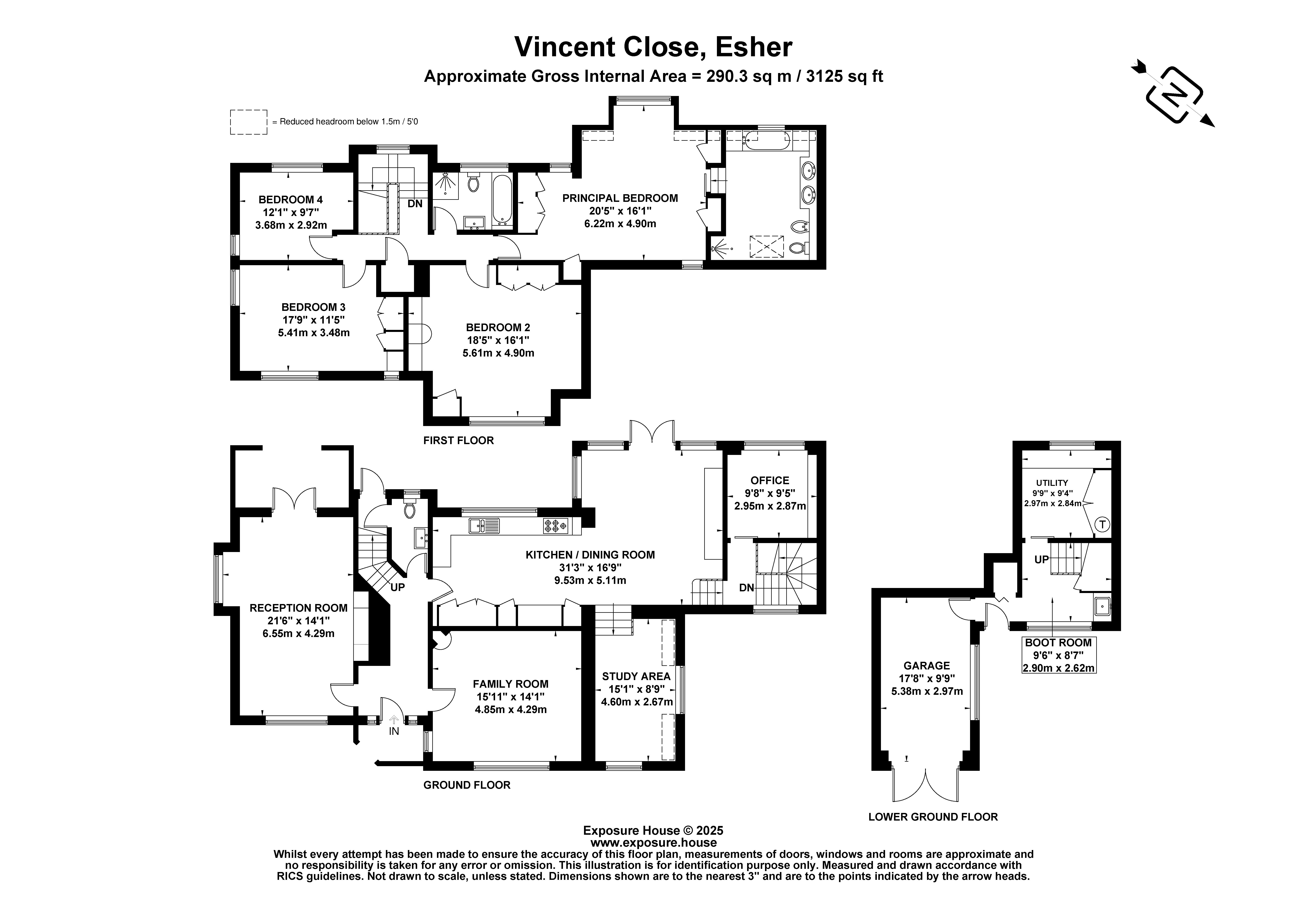 Imposing family home located in private cul de sac close to local amenities.DescriptionThis magnificent family home, conveniently located within easy reach of Esher high street and train station, yet set within a peaceful and quiet cul de sac, offers over 3000 sq ft of beautifully presented, well balanced and versatile accommodation.A covered porch leads through to a welcoming hallway which provides access to all principal reception rooms. To the left you access the impressive triple aspect reception room; a wonderful space with French doors to the rear opening onto a veranda. This spacious room is ideal for entertaining and features a bespoke media wall with an electric fireplace. Across the hall is the well-proportioned family room, fitted with a wood burning stove for the cooler months. Smart wooden flooring runs throughout the hallway and through to the reception rooms.The impressive kitchen/dining room is located at the rear of the property. The kitchen provides a generous range of contemporary dark green wall and base units with stainless steel handles, granite worktops and a unique curved central island. There are a range of integrated appliances including a double rangemaster oven and hob, an additional Miele oven, grill, warming oven and microwave. The kitchen leads through to the dining area where French doors open out to the garden, providing a wonderful indoor/outflow in the summer months.Steps down from the kitchen lead to a light and bright study area. There is a second separate office adjacent to the kitchen benefitting from built-in shelving and delightful views of the garden. A guest WC completes the accommodation on this floor.Stairs from the office lead to the lower ground floor which features a useful utility room and boot room with external access. The garage can also be accessed from here.On the first floor, the impressive principal bedroom features built-in wardrobes. Steps lead up to the open plan luxury en suite with twin basins, large walk-in shower and separate bath. There are three further double bedrooms, all which share use of the contemporary family bathroom.Externally, the beautiful south-west facing landscaped garden is an oasis of calm. A terrace to the left and area of raised decking to the right create ideal spots for al fresco dining, entertaining or simply relaxing. The lawn is surrounded on all sides by an abundance of mature trees and shrubs which help to create an idyllic, private and secluded setting.The property is approached via a large driveway providing parking for several cars in addition to the garage.LocationVincent Close is a small private gated cul de sac and is conveniently located close to the High Street and its amenities where you will find an Everyman cinema, several coffee shops, a Waitrose supermarket, as well as a great range of international restaurants and bars. Esher Cricket Club and Sandown Park racecourse are both nearby.Kingston upon Thames is close by and offers more extensive shopping including department stores and leisure activities.Esher station is just 1.2 miles away and provides regular and direct trains into Waterloo in just 23 minutes. The nearby A3 provides direct road access to central London and the Surrey countryside and Heathrow and Gatwick airports.Esher’s superb choice of schools is a major attraction when deciding where to live. There is an impressive array of leading independent schools including Claremont Fan Court, Milbourne Lodge, Feltonfleet, Reed’s, Danes Hill and Notre Dame, as well as highly regarded state schools.Square Footage: 3,125 sq ftAdditional InfoEstate Costs: £250 per annum