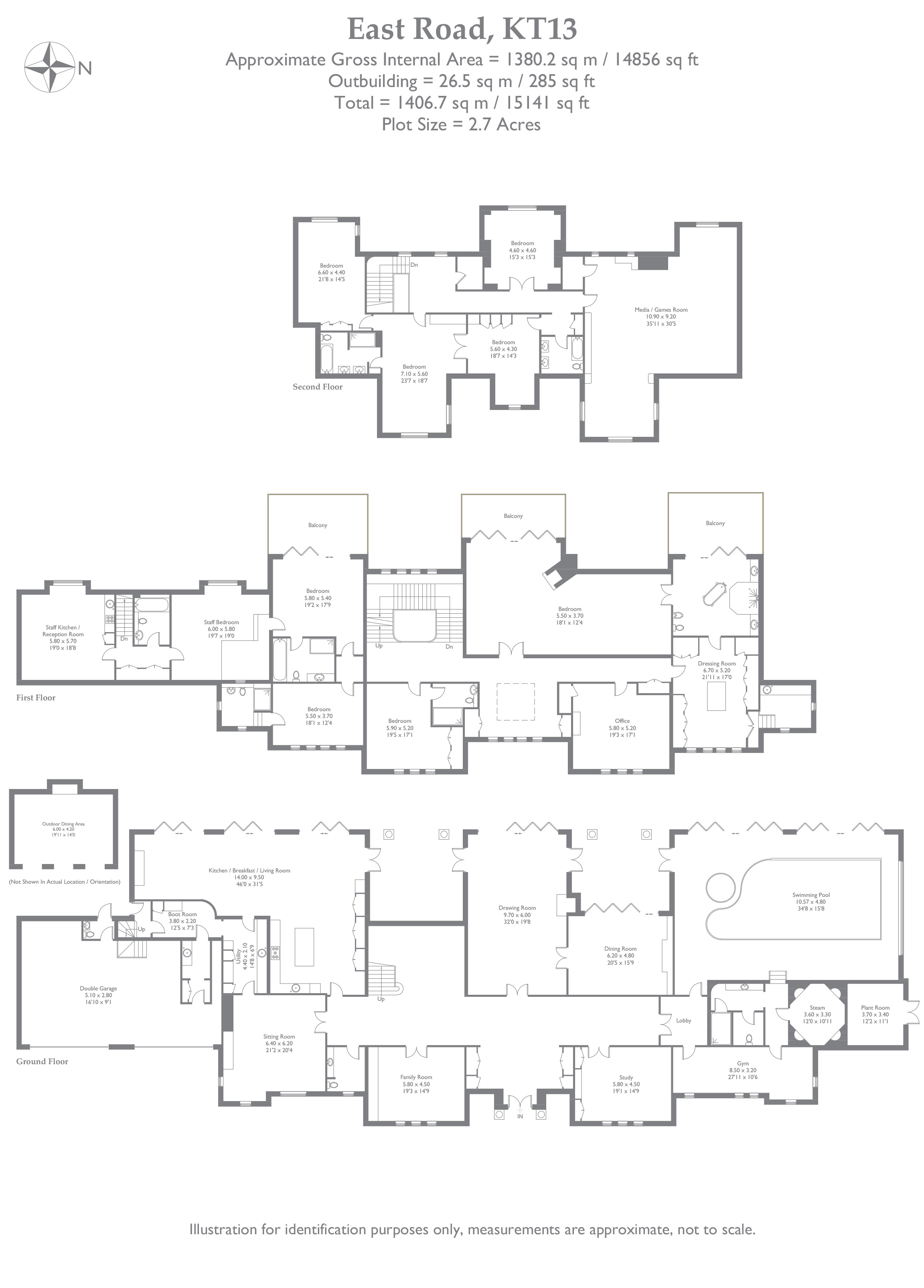 A magnificent eight bedroom estate set in about 2.6 acres of exquisitely landscaped, lily pond gardens on St George’s Hill’s premier road, East Road. Moments from the Lawn Tennis Club, with approximately 14,856 sq ft of finely arranged accommodation, Park Hill is designed for both grand entertaining and effortless family living.Beyond an impressive reception hall, the drawing room opens via bi fold doors to the grand water gardens. The drawing room is complemented by sitting and dining rooms, a study and a versatile family/TV room. The heart of the home is a generous kitchen with a family dining area and a living space. The ground floor further offers a utility and boot room.Upstairs, the principal suite features a private balcony and dressing room, with seven additional bedroom suites providing superb guest and family accommodation. A top-floor media/games room and separate office add further flexibility.Wellness and leisure are centre stage: An indoor swimming-pool complex with steam room, gym and changing facilities opens to the gardens, while a self contained staff apartment ensures discreet service. The specification includes air conditioning and underfloor heating. A double garage completes the offering.A byword for privacy and prestige, St George’s Hill is one of England’s most celebrated private estates. Set amid mature woodland and sweeping avenues, the estate combines grand architecture on generous plots with 24 hour security and discreet well-kept private roads. Daily life revolves around exceptional amenities: The historic St George’s Hill Golf Club, a renowned Harry Colt design, and the Lawn Tennis & Health Club with racket sports, pool and fitness facilities. Moments from Weybridge, Cobham and Esher, residents enjoy refined dining, boutique shopping and riverside walks, with the Thames and Surrey commons close at hand. Connectivity is effortless: Fast services from Weybridge reach London Waterloo in around half an hour; the A3 and M25 are nearby; Heathrow and Gatwick are within easy driving distance. The area is also prized for schooling, with leading independents such as St George’s (Weybridge) and acs Cobham among a strong local line-up. International in outlook yet reassuringly residential, St George’s Hill offers rare seclusion, first class amenities and seamless access to London—making it a perennial choice for uhnw families and global executives.Situated close to the St George’s Hill Lawn Tennis Club, Park Hill enjoys excellent connectivity: Weybridge 2 miles, Esher 4 miles, Heathrow 15 miles, Central London 22 miles, Gatwick 27 miles (all approx.).Property Features :Price: £19,500,000Tenure: FreeholdLocal Authority: ElmbridgeCouncil Tax Band: HEPC: DArea: Gross Internal Area – 14,856 sqft; Outbuilding – 285 sqft; Total – 15,141 sqftParking: 4 carsStaff Accommodation: Yes