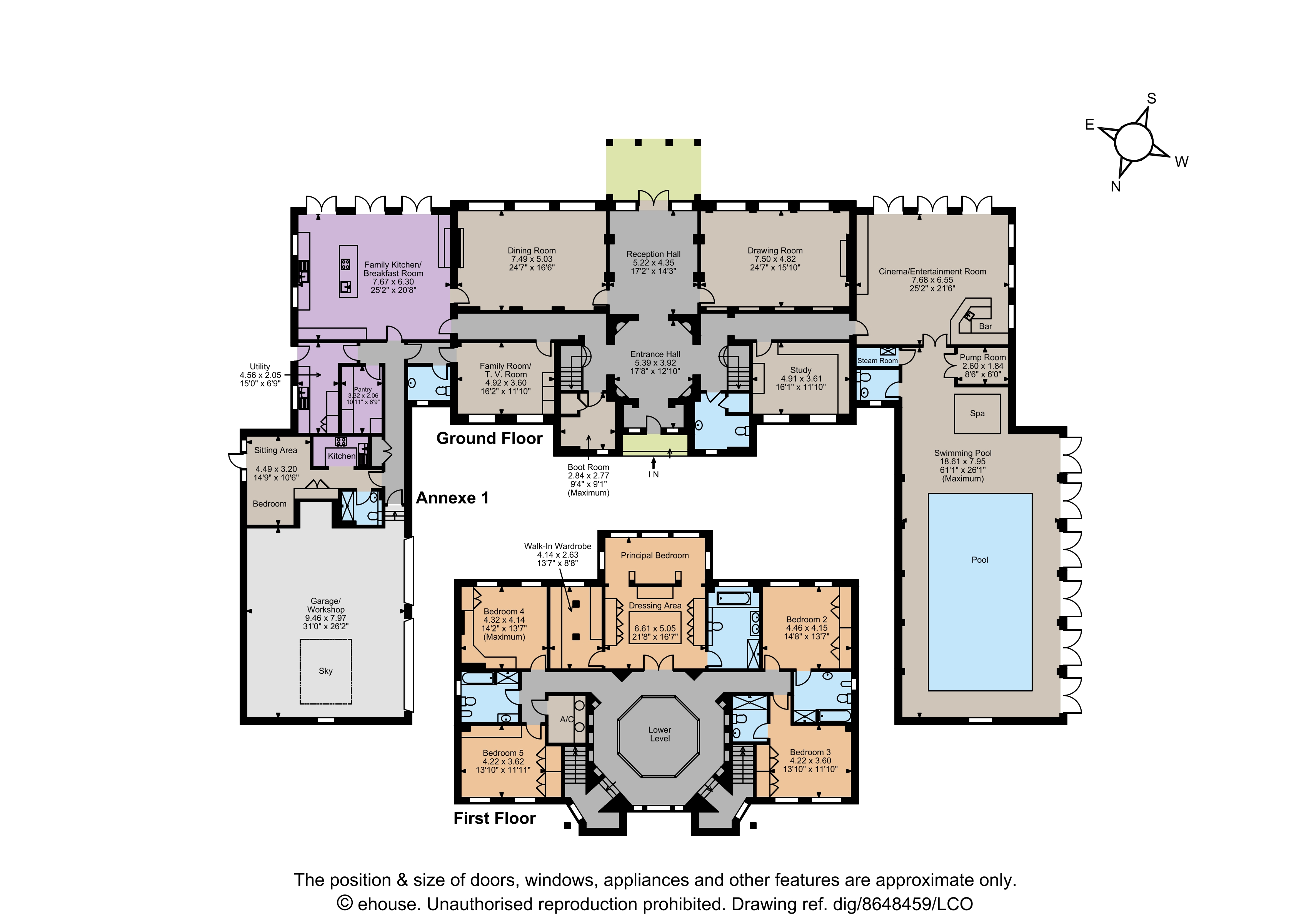 A magnificent detached luxury home, set in a stunning rural position with far-reaching grounds and views across the High Weald to the South Downs. Situated just outside the popular village of Handcross, the property provides more than 7,500 square feet of beautifully appointed accommodation, including five bedrooms, there is also an annexe and a spa with an indoor pool.Ashfold Grange is a handsome luxury home with elegant white-rendered elevations and tall sash windows. The light-filled accommodation includes spacious reception rooms on the ground floor and well-appointed bedrooms above.The property is set on the site of Ashfold, an impressive country mansion which was demolished in the 1950's, remenants of which can still be found in the garden.At the heart of the property is an impressive entrance hall with an octagonal galleried landing and a rear reception hall opening onto the terrace. The principal reception rooms-drawing and dining rooms-enjoy sunny, south-facing aspects, high ceilings, ornate cornicing, triple sash windows, and original fireplaces. A family room and a study provide quieter spaces to the front, while a generous air-conditioned cinema room with a bar and three sets of French doors offers excellent space for entertaining. The large kitchen/breakfast room with French doors to the terrace, includes stylish units from Clive Christian Metro Deco Collection, a central island with breakfast bar, and an extensive range of high-quality integrated appliances.The house also boasts a stunning luxury spa, with its curved timber ceiling, apex skylight and six sets of French doors opening onto the gardens. The facility houses a large indoor swimming pool and a jacuzzi, as well as steam room and shower.Upstairs, the galleried landing provides access to five double bedrooms. These include the principal bedroom with its dressing area, walk-in wardrobe, en suite bathroom and panoramic views across the grounds. The four further bedrooms all have built-in storage. Two are en suite, while there is also a family bathroom.There is a self-contained annexe, with a kitchen, sitting room, bedroom, and shower room, connected internally and via a private entrance; ideal for staff, guests or family members.At the property entrance, security gates open onto a long driveway winding through stunning grounds flanked by woodland, leading to the house and parking. The integrated garage accommodates two vehicles, with a detached garage block providing space for up to three more. Surrounding the house are breathtaking gardens featuring patios for al fresco dining, ornamental box hedging, terraced lawns, ponds, water features, and a pergola-shaded seating area. These beautifully maintained gardens offer superb, uninterupted views to the South Downs and are professionally designed as separate themed areas including the Welsh garden, the Japanese garden, the Wild gardens and pond and the Ice garden which incorporates the original ice house from the 1800's.A further feature of the garden is the long stone wall, remaining from the former mansion house which stood on these grounds. On the west terrace outside the swimming pool, there is an award winning Koi pond surrounded by a beautiful Mediterranean feel rockery. Beyond the garden are the fields and stable area to one side. To the front and side of the property is an attractive area of woodland with mature trees and rhododendrons, interspersed by pathways.In all the plot extends to 16.6 acres.The property lies just outside the West Sussex village of Handcross, surrounded by the countryside of the High Weald National Landscape and within easy reach of Hayward’s Heath, Horsham and Crawley. Handcross has several everyday amenities, including a post office and village store, and a local butcher. There are primary schools in Handcross and nearby Staplefield, while the independent Handcross Park Preparatory School is also found in Handcross. The A23 is just a mile away, providing easy access towards Crawley and Gatwick Airport to the north, and Brighton to the south. Horsham, six miles away, provides an excellent choice of shops and supermarkets, plus a mainline station with regular services to London Bridge and Victoria.
