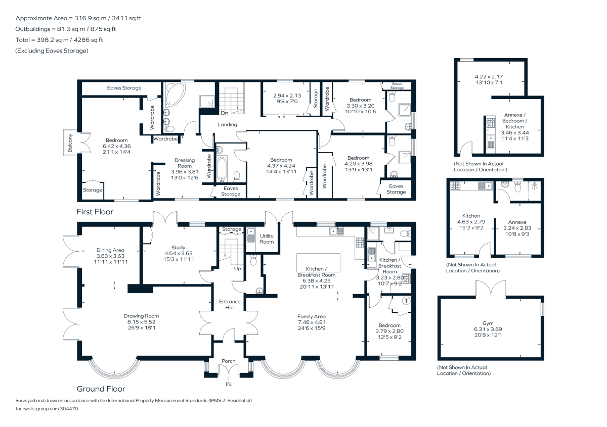 This gorgeous family home offers light and spacious accommodation arranged over two floors.On the ground floor is a welcoming entrance hall leading, on the left, to the drawing room, dining room and study, all of which have doors opening onto the well-maintained garden.To the right of the hallway is the open plan kitchen/breakfast/family room. Additionally there is a utility room and a guest cloakroom along with a self-contained adjoining annexe with a sleeping area, kitchen and shower room.To the first floor the generous principal bedroom suite has a walk in wardrobe, balcony overlooking the garden and an en-suite bathroom.There are three further double bedrooms, all with en-suites, along with a single bedroom/studyThere are two self-contained annexes available via separate negotiation. To check broadband and mobile phone coverage please visit Ofcom here