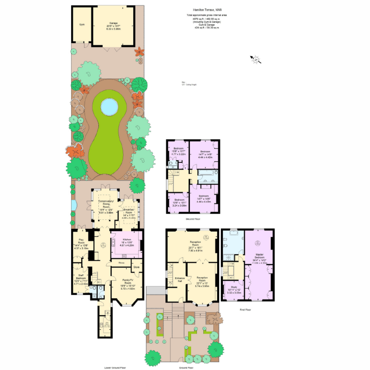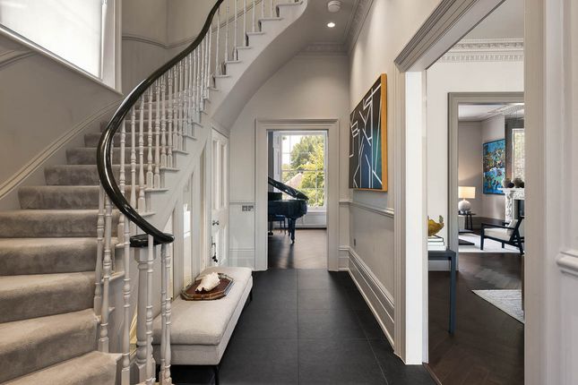 A six-bedroom Victorian house spanning 5,126 sq ft, situated on Hamilton Terrace in St John’s Wood. The property offers extensive family and entertaining space, a 92 ft landscaped garden, gated off-street parking for two large cars and a converted garage offering gym or workspace use.Internally, the house is laid out across multiple levels and has been carefully interior designed to suit modern family living. The ground and lower floors comprise generous reception and dining spaces, while the upper levels feature a principal suite with dressing room and ensuite, four further bedrooms and a sixth bedroom suitable for staff or guests. Additional spaces include a study, cloakroom and conservatory.Hamilton Terrace is located on the west side of St John’s Wood, 450 metres from St John’s Wood Underground Station (Jubilee Line) and 500 metres from Maida Vale Station (Bakerloo Line). The area offers strong transport links to Marylebone, Mayfair and the West End, as well as nearby local shops, cafés and restaurants. Bus routes run from Wellington Road (A41) and Maida Vale (A5)
