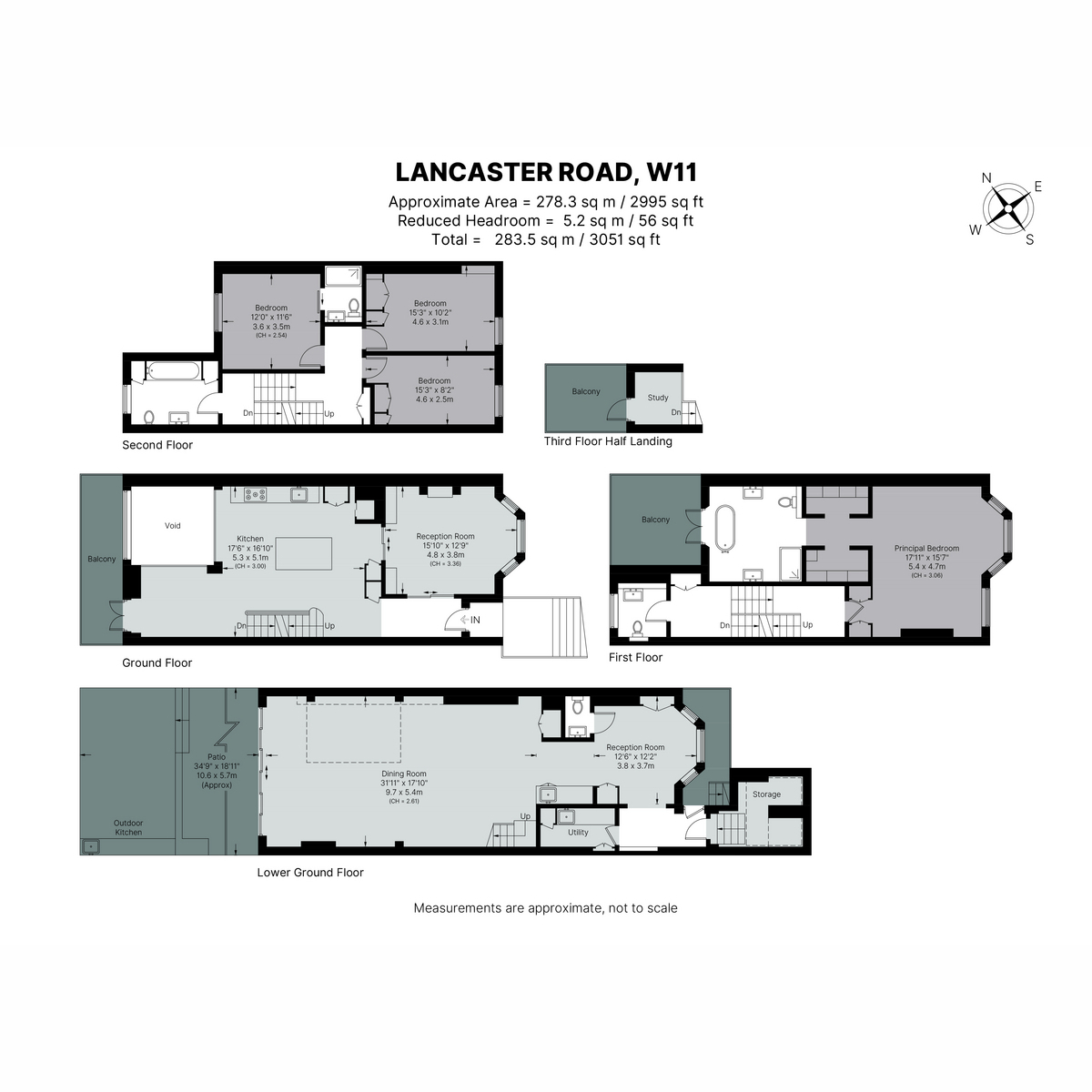 This wonderful home spans over four floors and offers very well laid out accommodation that will suit a family perfectly. Retaining period features such as the elegant cornicing and ceiling roses, the interior design incorporates modern details such as a double-height void over the living space, exposed brick wall, modern marble kitchen, large picture windows, and a sliding glass door leading onto the garden.Behind the colourful and quintessentially Notting Hill facade, this property boasts 3,051 sq ft of living space. The house has an extremely spacious feeling, with abundant natural light and multiple outdoor spaces including the garden, which is equipped with an outdoor kitchen, balconies and a roof terrace.There is a dumbwaiter between the kitchen and sitting room on the raised ground floor, allowing food and drinks to be easily transported to the dining and living area on the lower ground floor, which leads out onto the garden.The principal bedroom suite occupies the whole of the first floor, with a large double walk-in wardrobe and beautiful primary bathroom, complete with rainfall shower and freestanding tub in front of French doors that lead onto a private balcony.Three further bedrooms are situated on the second floor. A guest bedroom leads onto it's own en-suite shower room with pitched roof and skylight, and the childrens' bedrooms share a family bathroom on the landing. A study space leads out onto the roof terrace, with views across Notting Hill.Lancaster Road is ideally situated just off of Portobello Road, and in close proximity to Notting Hill and Westbourne Grove, with a multitude of wonderful restaurants, cafes and shops within walking distance.Please use the reference 439448 when contacting us