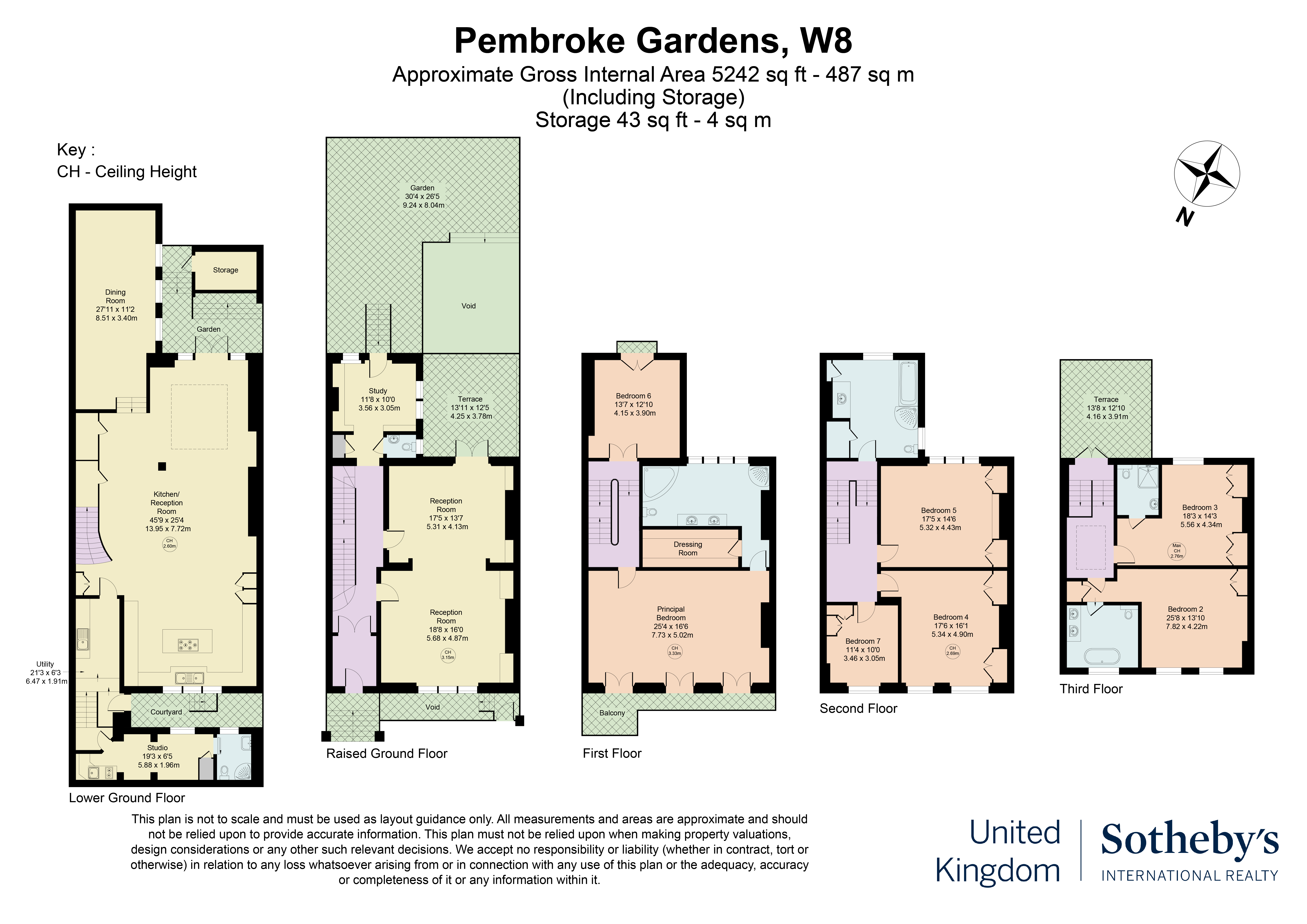 DescriptionSpanning 5,242 sq. Ft., this six-bedroom property boasts a uniquely generous internal footprint and wonderful open spaces.The entrance hall leads right into the main reception, a striking double reception room with ornate cornices and rich wooden parquet floors. At its centre, a beautifully crafted fireplace provides the focal point. Crittall doors open onto the adjoining terrace, extending the living space outdoors and stepping down to the south-facing gardenOn the lower ground floor, an open-plan reception opens into the garden, creating a seamless connection between all the living areas. A separate dining room sits nearby, and a private courtyard at the opposite end enhances the sense of light and space.The principal suite occupies the first floor, complete with a luxurious ensuite, walk-in closet and private balcony. Five additional bedrooms are arranged across the upper floors, two of which are ensuite. A stunning roof terrace can be accessed from the third-floor landing, offering an additional alfresco retreat.A study on the raised ground floor provides a quiet setting for working, while a self-contained studio offers ideal accommodation for guests or live-in staff. Additional storage and a utility room complete the offering.This immaculately maintained family residence holds a prime position on Pembroke Gardens, a quiet residential street in one of London’s most sought-after neighbourhoods. The exceptional dining, shopping and leisure of Kensington High Street are within easy reach, as are the verdant expanses of Holland Park.