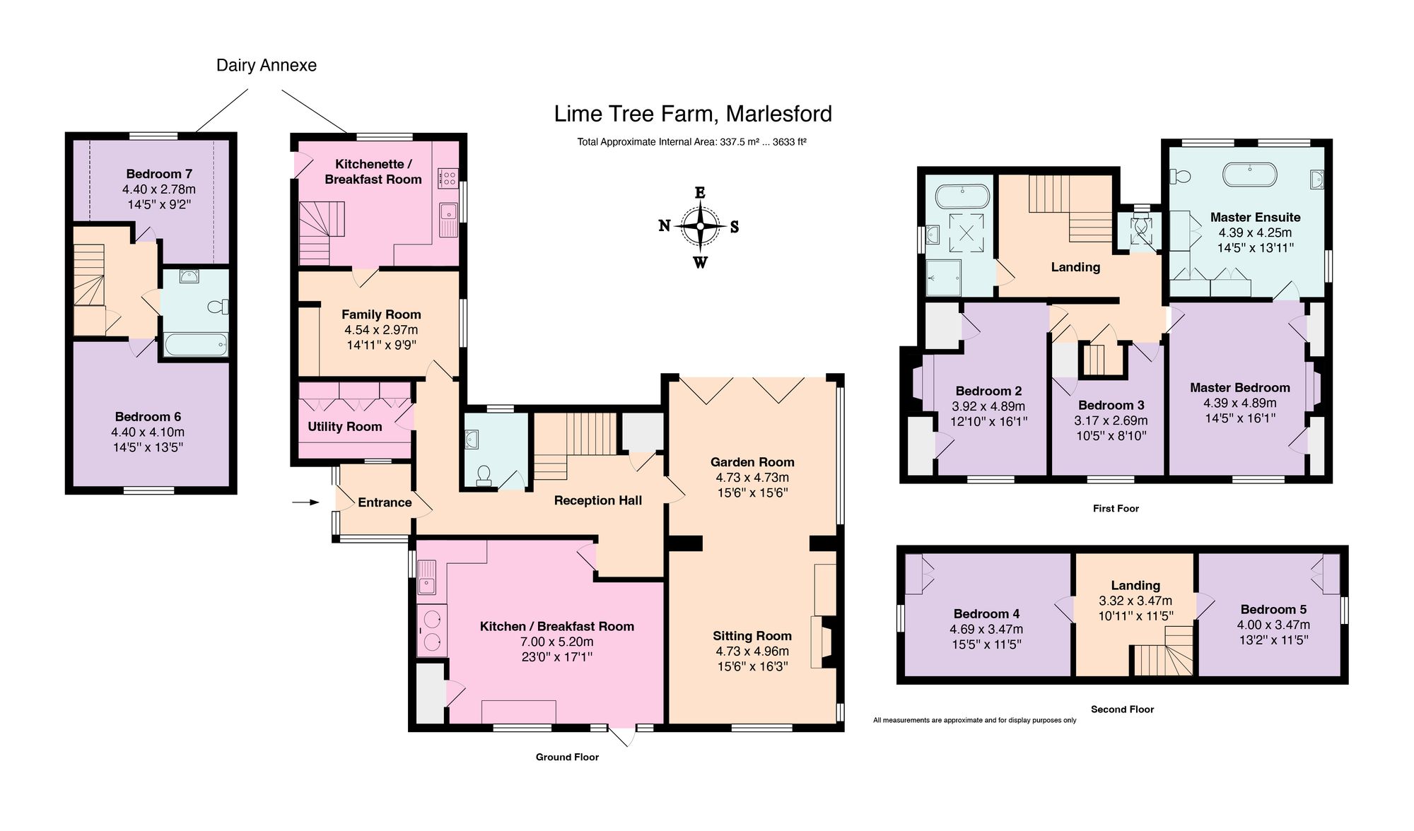 Lime Tree Farmhouse is a striking red-brick period home, thoughtfully refurbished and extended to create a light, spacious and versatile residence. Set within large plot of beautifully landscaped gardens and grounds bordered by the River Ore, this unique property blends timeless character with modern comforts.The main house offers elegant, well-presented accommodation including an impressive sitting room with oak flooring and a feature fireplace, which flows into a garden room with twin full-height glazed elevations and bi-fold doors leading onto a wide suntrap terrace. The fully fitted kitchen, complete with aga and limestone flooring, opens into a dining area with direct access to the front garden, while a welcoming entrance hall links to the former dairy wing where a snug or study, cloakroom and secondary kitchenette are found.On the upper floors, the well-proportioned master suite enjoys far-reaching views and a contemporary en suite bathroom with vaulted ceiling and central bath. In total, the house provides seven bedrooms and four bathrooms, with two bedrooms and an additional bathroom set within the dairy wing, accessed independently if required.The property benefits from lpg central heating, a recently installed solar array with battery storage, and an EV charger. A shingle driveway lead to a parking courtyard, while the converted grain store provides a highly flexible space suitable as a home office, games room, storage or studio. The formal front garden is part-walled with lawns, deep herbaceous borders and a central path leading to the picket gate. To the side lies a kitchen garden with raised beds and a heritage greenhouse, while the rear gardens sweep down to the stream, interspersed with mature trees and orchard planting.Located on the edge of Marlesford, the farmhouse enjoys a peaceful hamlet-style setting, yet remains highly convenient for the market towns of Framlingham, Woodbridge, Saxmundham and Aldeburgh, all of which provide excellent shopping, schools and local facilities. The Suffolk Coast, Tunstall and Rendlesham Forests, and the historic village of Orford all lie within easy reach. Campsea Ash rail station is just 1.3 miles away, offering regular services to Ipswich with onward connections to London, while the nearby A12 provides fast links to Ipswich, Cambridge, London and the Midlands.For further details or to arrange a viewing, please contact Potter's Estate Agents.Prospective tenants should be aware that money laundering regulations require identification documentation during the referencing process. While every effort has been made to ensure the accuracy of this description, it does not form part of any offer or contract. Room measurements are approximate and should be independently verified. Tenants are advised to confirm furnishings and parking arrangements before proceeding. Prior to signing any tenancy agreement, it is essential to review the contract and inventory thoroughly.(1) money laundering regulations - prospective tenants will be asked to produce identification documentation during the referencing process and we would ask for your co-operation in order that there will be no delay in agreeing a tenancy.(2) These particulars do not constitute part or all of an offer or contract.(3) The text, photographs and plans are for guidance only and are not necessarily comprehensive.(4) Measurements: These approximate room sizes are only intended as general guidance. You must verify the dimensions carefully to satisfy yourself of their accuracy.(5) You should make your own enquiries regarding the property, particularly in respect of furnishings to be included/excluded and what parking facilities are available.(6) Before you enter into any tenancy for one of the advertised properties, the condition and contents of the property will normally be set out in a tenancy agreement and inventory. Please make sure you carefully read and agree with the tenancy agreement and any inventory provided before signing these documents.EPC Rating: DLocationLocated on the edge of Marlesford, the farmhouse enjoys a peaceful hamlet-style setting, yet remains highly convenient for the market towns of Framlingham, Woodbridge, Saxmundham and Aldeburgh, all of which provide excellent shopping, schools and local facilities. The Suffolk Coast, Tunstall and Rendlesham Forests, and the historic village of Orford all lie within easy reach. Campsea Ash rail station is just 1.3 miles away, offering regular services to Ipswich with onward connections to London, while the nearby A12 provides fast links to Ipswich, Cambridge, London and the Midlands.